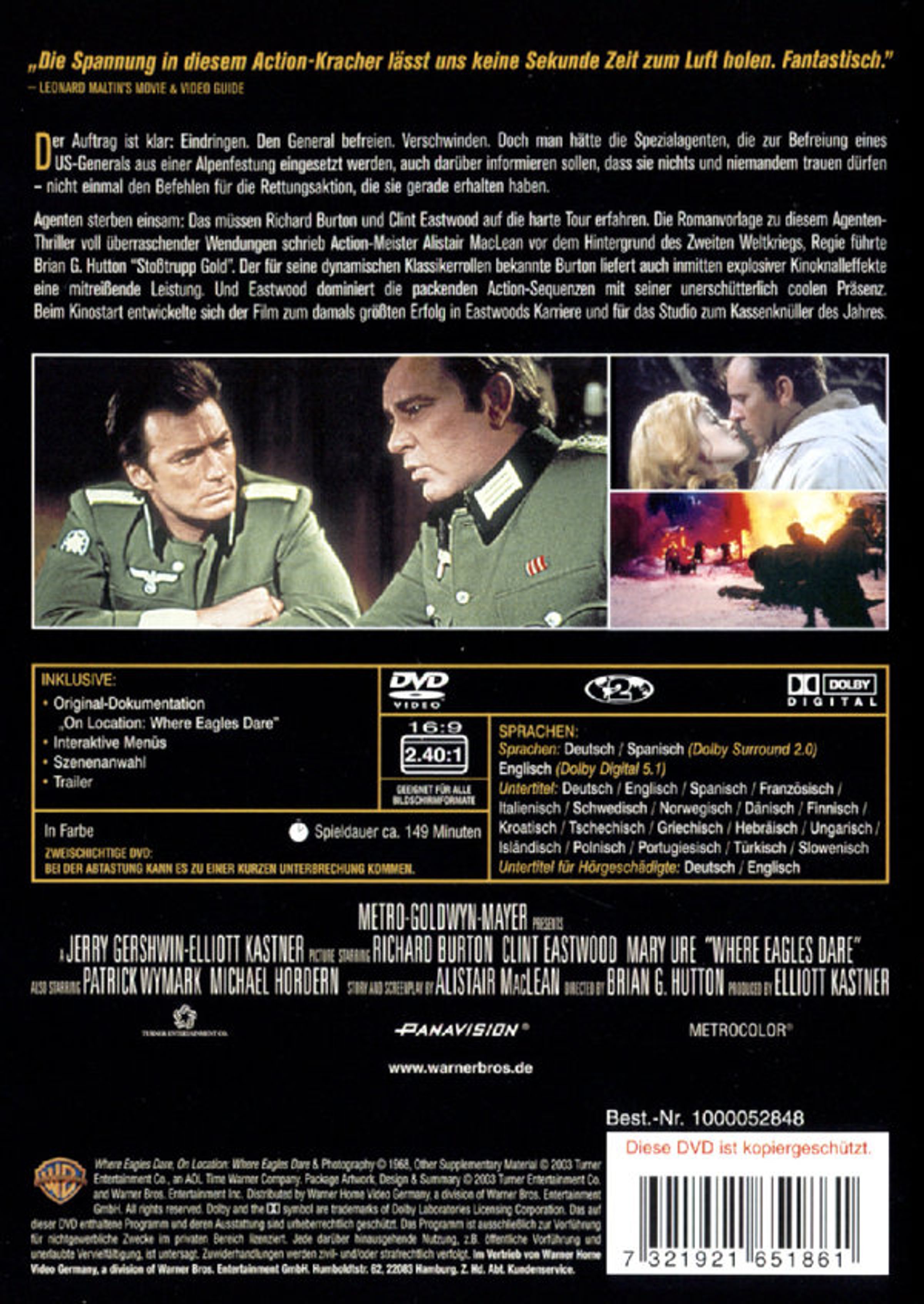 Agenten sterben einsam: Das müssen Richard Burton und Clint Eastwood auf die harte Tour erfahren. Die Romanvorlage zu diesem Agenten-Thriller voll überraschender Wendungen schrieb Action-Meister Alistair MacLean vor dem Hintergrund des Zweiten Weltkriegs, Regie führte Brian G. Hutton "Stoßtrupp Gold". Der für seine dynamischen Klassikerrollen bekannte Burton liefert auch inmitten explosiver Kinoknalleffekte eine mitreißende Leistung. Und Eastwood dominiert die packenden Action-Sequenzen mit seiner unerschütterlich coolen Präsenz. Beim Kinostart entwickelte sich der Film zum damals größten Erfolg in Eastwood Karriere und für das Studio zum Kassenknüller des Jahres.
