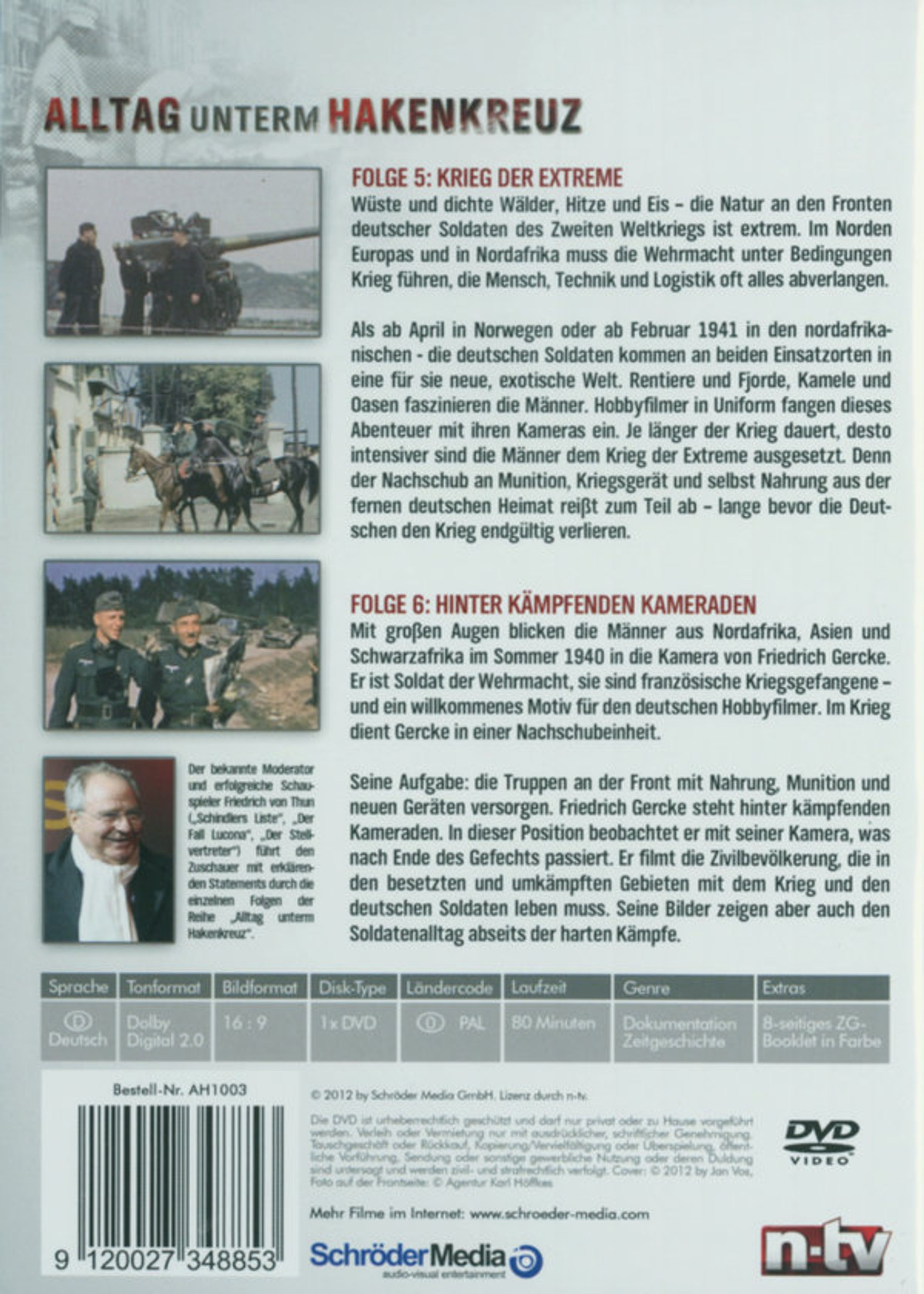 Folge 5: Krieg der Extreme Als ab April in Norwegen oder ab Februar 1941 in den nordafrikanischen - die deutschen Soldaten kommen an beiden Einsatzorten in eine für sie neue, exotische Welt. Rentiere und Fjorde, Kamele und Oasen faszinieren die Männer. Hobbyfilmer in Uniform fangen dieses Abenteuer mit ihren Kameras ein. Je länger der Krieg dauert, desto intensiver sind die Männer dem Krieg der Extreme ausgesetzt. Denn der Nachschub an Munition, Kriegsgerät und selbst Nahrung aus der fernen deutschen Heimat reißt zum Teil ab lange bevor die Deutschen den Krieg endgültig verlieren. Folge 6: Hinter kämpfenden Kameraden Mit großen Augen blicken die Männer aus Nordafrika, Asien und Schwarzafrika im Sommer 1940 in die Kamera von Friedrich Gercke. Er ist Soldat der Wehrmacht, sie sind französische Kriegsgefangene und ein willkommenes Motiv für den deutschen Hobbyfilmer. Im Krieg dient Gercke in einer Nachschubeinheit.