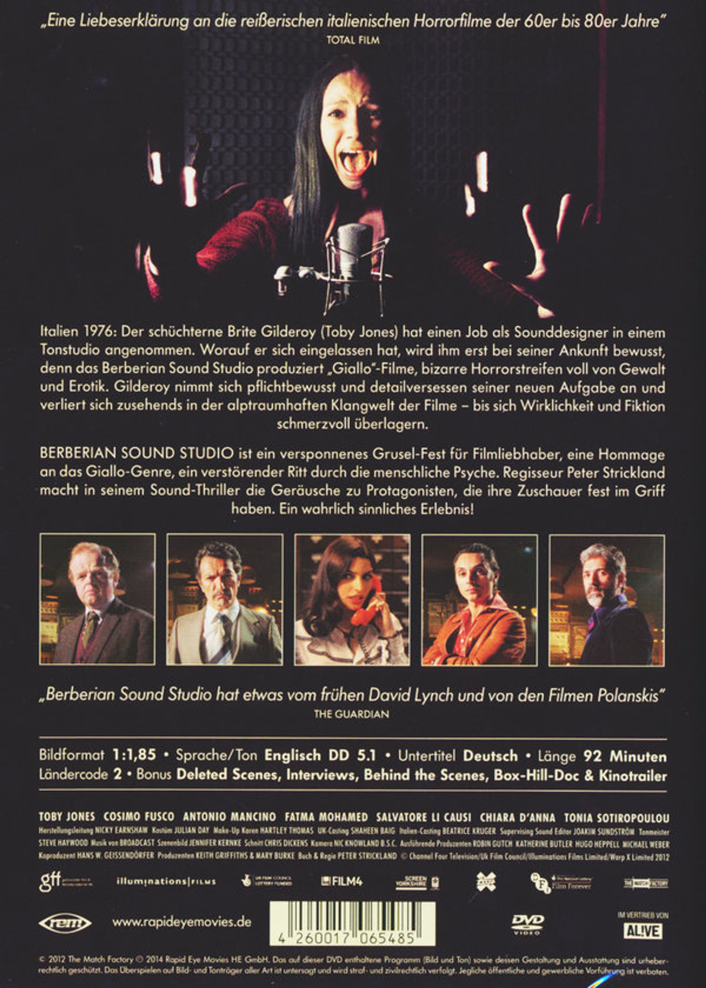 Italien 1976: Der schüchterne Brite Gilderoy hat einen Job als Sounddesigner in einem Tonstudio angenommen. Worauf er sich eingelassen hat, wird ihm erst bei seiner Ankunft bewusst, denn das Berberian Sound Studio produziert „Giallo“-Filme, bizarre Horrorstreifen voll von Gewalt und Erotik. Gilderoy nimmt sich pflichtbewusst und detailversessen seiner neuen Aufgabe an und verliert sich zusehends in der alptraumhaften Klangwelt der Filme – bis sich Wirklichkeit und Fiktion schmerzvoll überlagern.