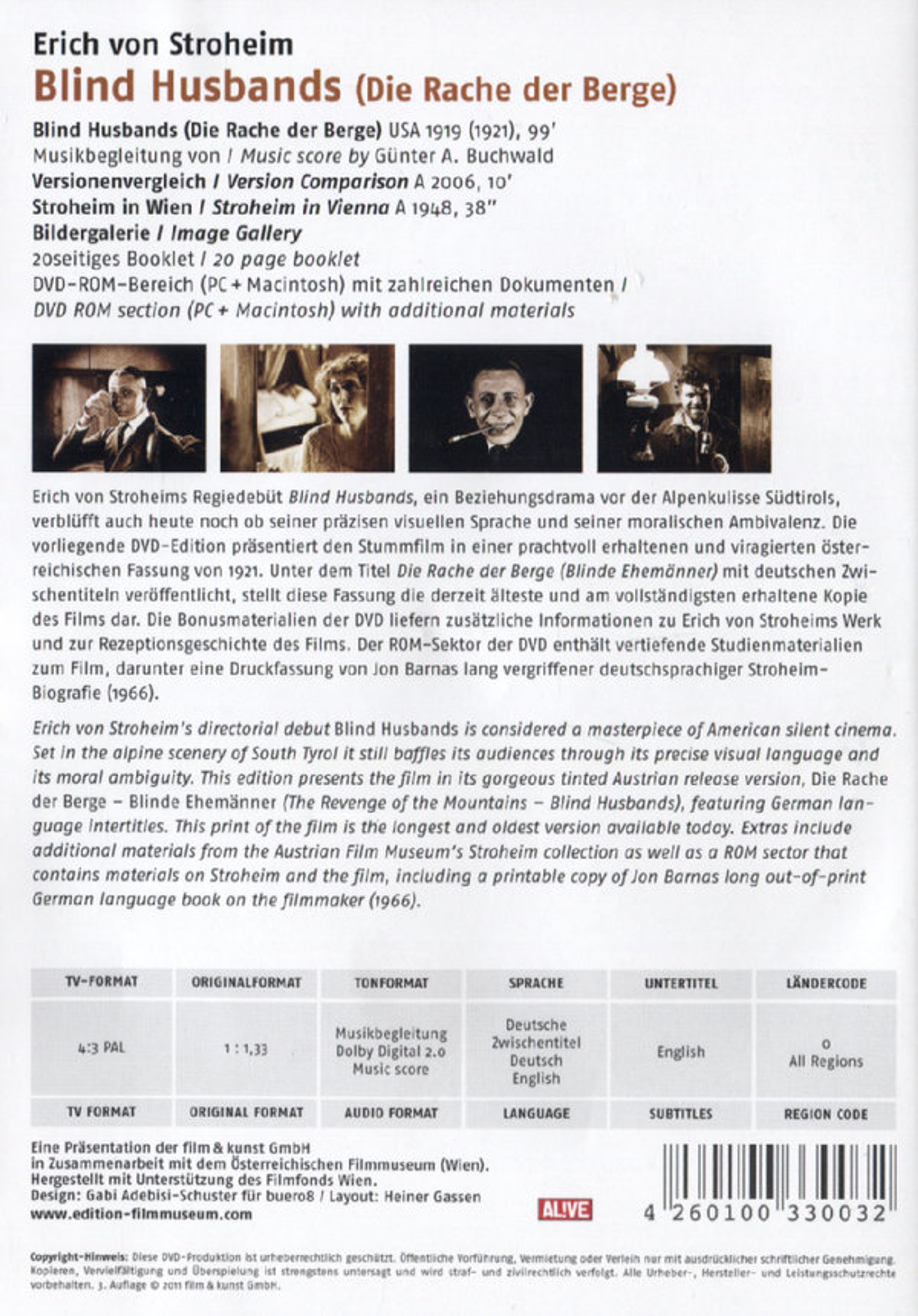Erich von Stroheims Regiedebüt Blind Husbands, ein Beziehungsdrama vor der Alpenkulisse Südtirols, verblüfft auch heute noch ob seiner präzisen visuellen Sprache und seiner moralischen Ambivalenz. Die vorliegende DVD-Edition präsentiert den Stummfilm in einer prachtvoll erhaltenen und viragierten österreichischen Fassung von 1921. Unter dem Titel "Die Rache der Berge" (Blinde Ehemänner) mit deutschen Zwischentiteln veröffentlicht, stellt diese Fassung die derzeit älteste und am vollständigsten erhaltene Kopie des Films dar. Die Bonusmaterialien der DVD liefern zusätzliche Informationen zu Erich von Stroheims Werk und zur Rezeptionsgeschichte des Films. Der ROM-Sektor der DVD enthält vertiefende Studienmaterialien zum Film.