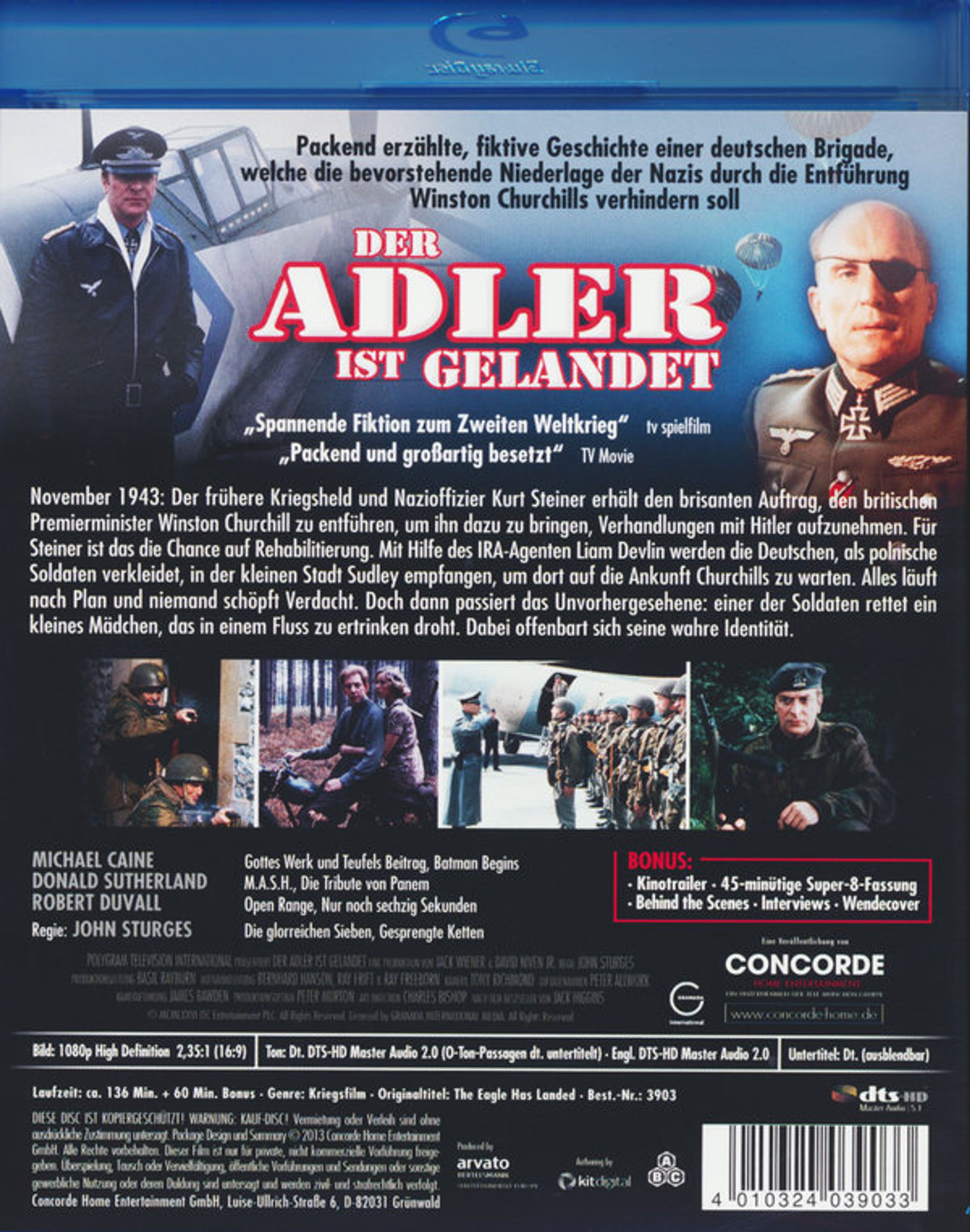 Als am 6. November 1943 Reichsführer Heinrich Himmler die Nachricht "Der Adler ist gelandet" erreicht, weiss er, dass sein Himmelfahrtskommando sicher auf englischem Boden gelandet ist: Sechzehn deutsche Fallschirmjäger mit dem Auftrag, den englischen Premierminister Winston Churchill zu entführen. Unter dem Kommando von Oberst Kurt Steiner schlagen sich die deutschen Soldaten in Richtung Norfolk durch, wo Churchill nichts ahnend ein ruhiges Wochenende in einem Landhaus verbringen wollte. Die Geheim-Operation ist fast zum Scheitern verurteilt, wäre da nicht Oberst Steiner...
