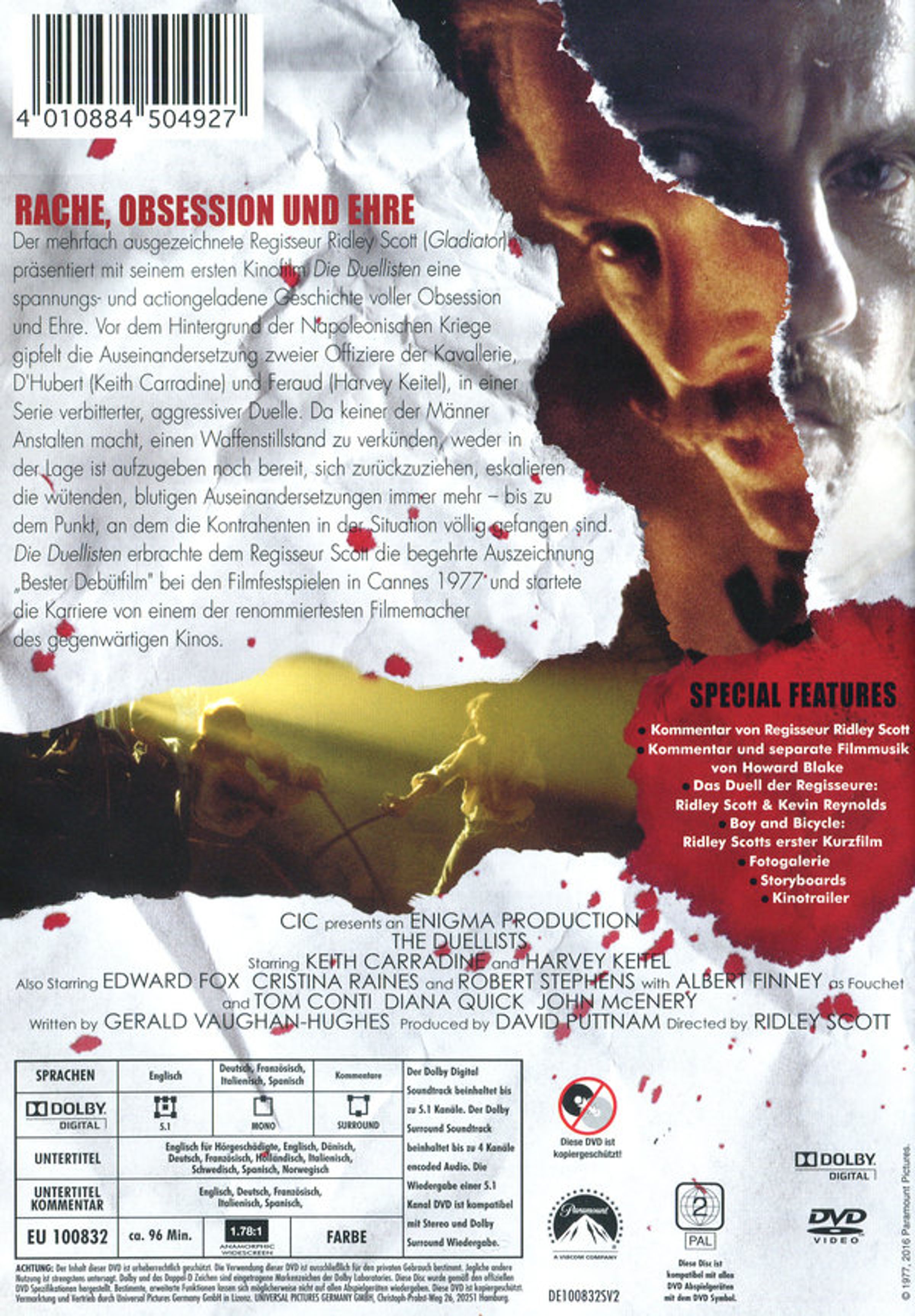 Lexikon des Int.Films: "Während der Napoleonischen Kriege duellieren sich zwei französische Offiziere über Jahre hinaus bei jeder sich bietenden Gelegenheit, obwohl sie sich allmählich nicht mehr an die Ursache ihres Hasses erinnern können. Ungewöhnlich brillant inszeniertes Erstlingswerk mit von der zeitgenössischen Malerei inspirierten außerordentlich schönen Bildern."Mehr von Ridley Scott