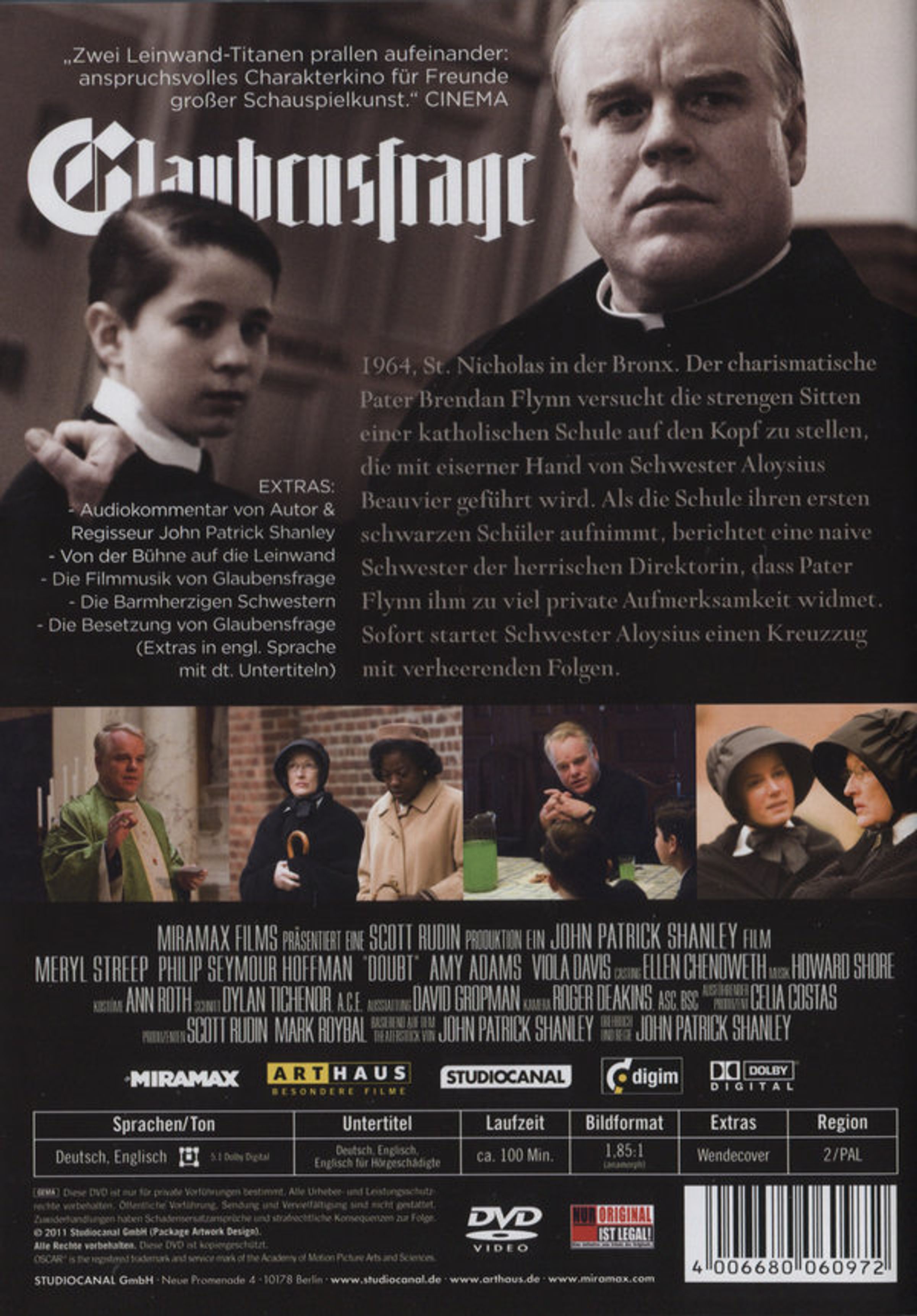 - Audiokommentar von Autor / Regisseur John Patrick Shanley; Die Barmherzigen Schwestern; Die Besetzung von Glaubensfrage; Die Filmmusik von Glaubensfrage; Von der Bühne auf die Leinwand; Extras in engl. Sprache mit dt. Untertiteln;