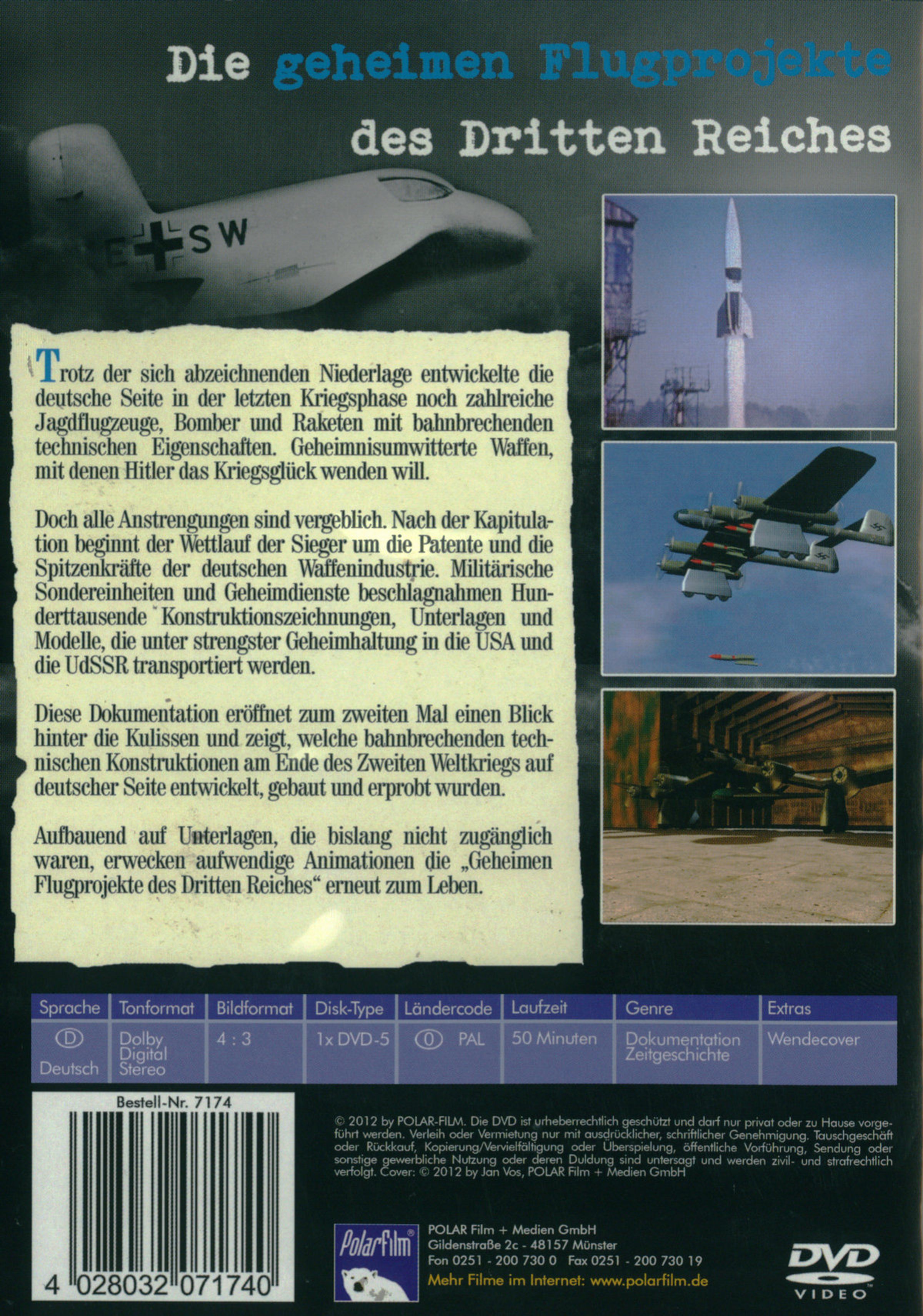 Trotz der sich abzeichnenden Niederlage entwickelte die deutsche Seite in der letzten Kriegsphase noch zahlreiche Jagdflugzeuge, Bomber und Raketen mit bahnbrechenden technischen Eigenschaften. Geheimnisumwitterte Waffen, mit denen Hitler das Kriegsglück wenden will. Doch alle Anstrengungen sind vergeblich. Nach der Kapitulation beginnt der Wettlauf der Sieger um die Patente und die Spitzenkräfte der deutschen Waffenindustrie. Militärische Sondereinheiten und Geheimdienste beschlagnahmen Hunderttausende Konstruktionszeichnungen, Unterlagen und Modelle, die unter strengster Geheimhaltung in die USA und die UdSSR transportiert werden. Diese Dokumentation eröffnet zum zweiten Mal einen Blick hinter die Kulissen und zeigt, welche bahnbrechenden technischen Konstruktionen am Ende des Zweiten Weltkriegs auf deutscher Seite entwickelt, gebaut und erprobt wurden. Aufbauend auf Unterlagen, die bislang nicht zugänglich waren, erwecken aufwendige Animationen die " Geheimen Flugprojekte des Dritten Reiches " erneut zum Leben.