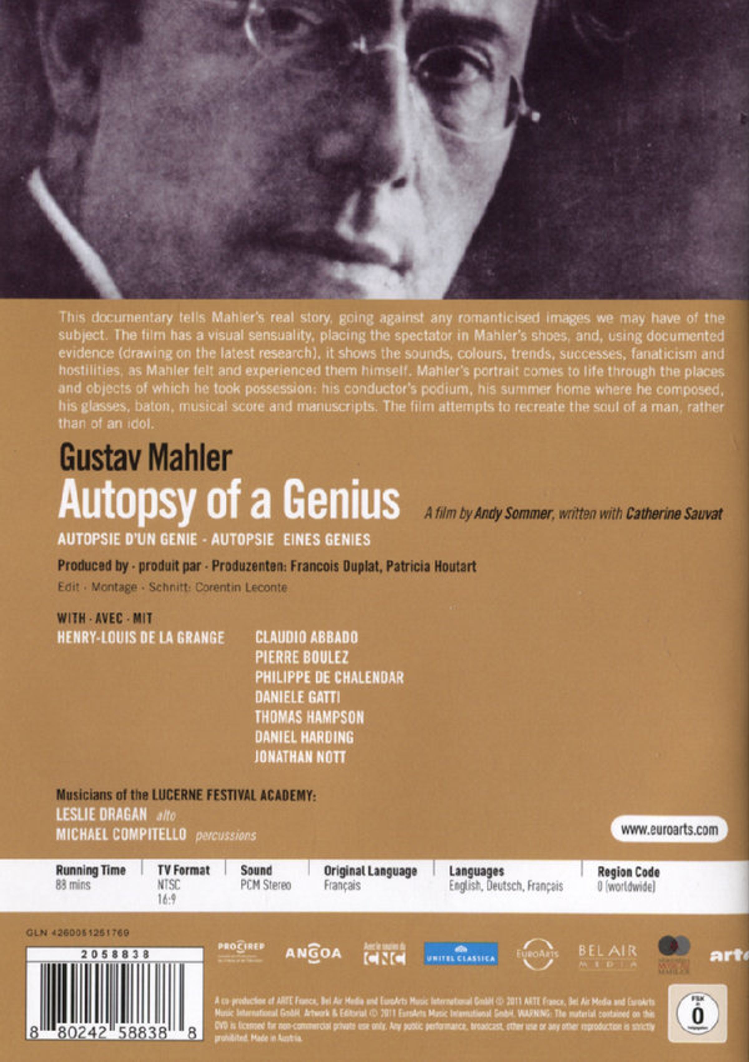 Der Französische Regisseur Andy Sommer ist bekannt für seine außergewöhnlichen Dokumentationen über Mozart, Beethoven, Schubert und Berlioz. Sein Film über Gustav Mahler zeichnet ein Portrait des musikalischen Genies Gustav Mahler, der zugleich Komponist, Dirigent und Opernhausdirektor war. Die filmische “Autopsie”des Genies Mahler setzt sich fort, hinein in die Wirkungen seiner Musik nach seinem Tod und in die Interpretationen durch Dirigenten wie Bruno Walter, Willem Mengelbergund Leonard Bernstein. Mit Claudio Abbado, Pierre Boulez, Daniele Gatti, Daniel Harding und Jonathan Nott.