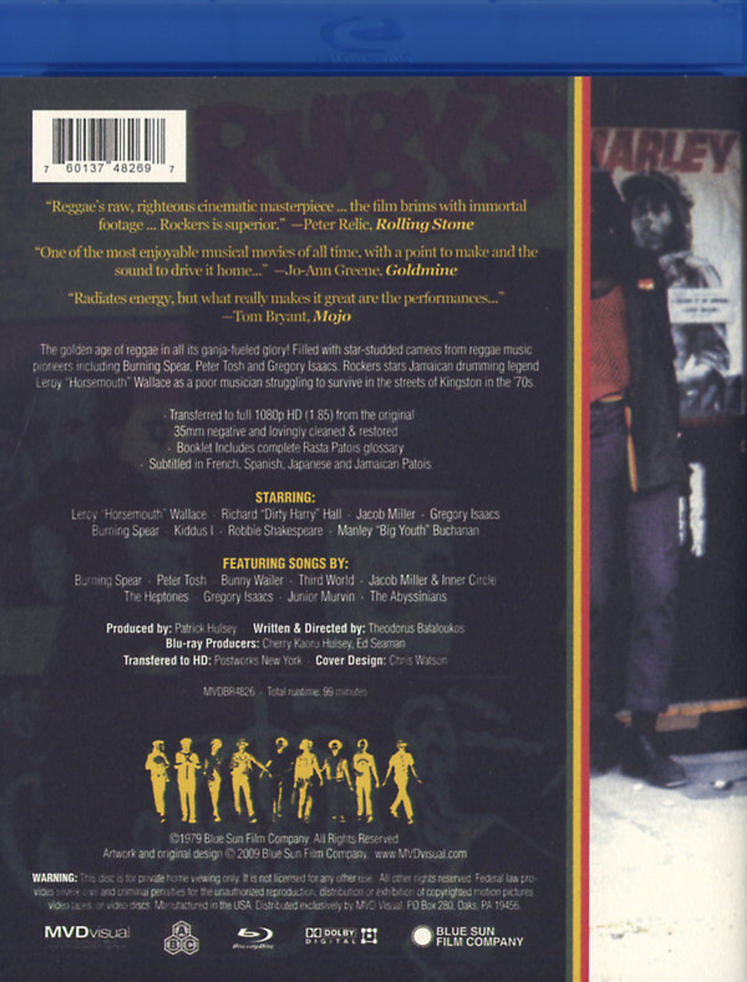 Classic reggae film transferred to HD from original 35mm negative and lovingly cleaned & restored! Here is the classic reggae film transferred to HD from original 35mm negative and lovingly cleaned & restored! Starring Leroy "Horsemouth" Wallace and Richard "DirtyHarry" Hall, ROCKERS is a Robin Hood style story of oppressed Jamaican musicians getting even with the "mafia types" in the business. Featuring Burning Spear, Bunny Wailer, Third World, Peter Tosh, Jacob Miller, Gregory Isaacs, Kiddus I, Junior Murvin, Inner Circle, the Heptones, & Abyssinians. ROCKERS includes acting roles and appearances by Jacob Miller, Gregory Isaacs, Burning Spear, Kiddus I, Leroy Smart, more. "Rockers is superior" -- ROLLING STONERun Time: 99 minsRegion Code: 0Subtitled in French, Spanish, Japanese and Jamaican PatoisAudio: 5.1 SURROUNDDirector: TED BAFALOUKASProducers: PATRICK HULSEY