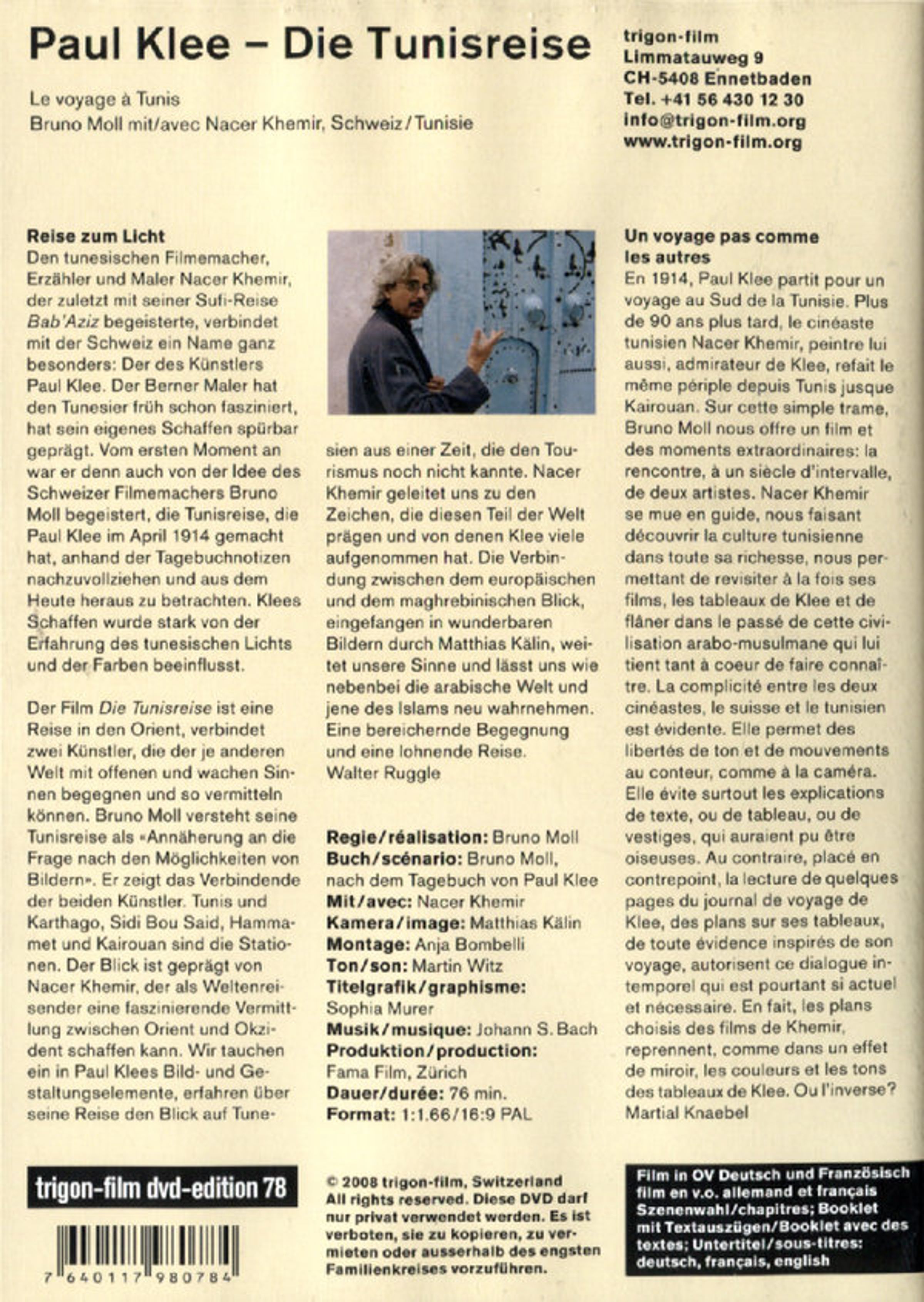 Tunis und Karthago, Sidi Bou Said, Hammamet und Kairouan sind die Stationen. Der Blick ist geprägt von Nacer Khemir, der als Weltenreisender eine faszinierende Vermittlung zwischen Orient und Okzident schaffen kann. Wir tauchen ein in Paul Klees Bild- und Gestaltungselemente, erfahren über seine Reise den Blick auf Tunesien aus einer Zeit, die den Tourismus noch nicht kannte. Nacer Khemir geleitet uns zu den Zeichen, die diesen Teil der Welt prägen und von denen Klee viele aufgenommen hat. Die Verbindung zwischen dem europäischen und dem maghrebinischen Blick, eingefangen in wunderbaren Bildern durch Matthias Kälin, weitet unsere Sinne und lässt uns wie nebenbei die arabische Welt und jene des Islams neu wahrnehmen. Eine bereichernde Begegnung und eine lohnende Reise.