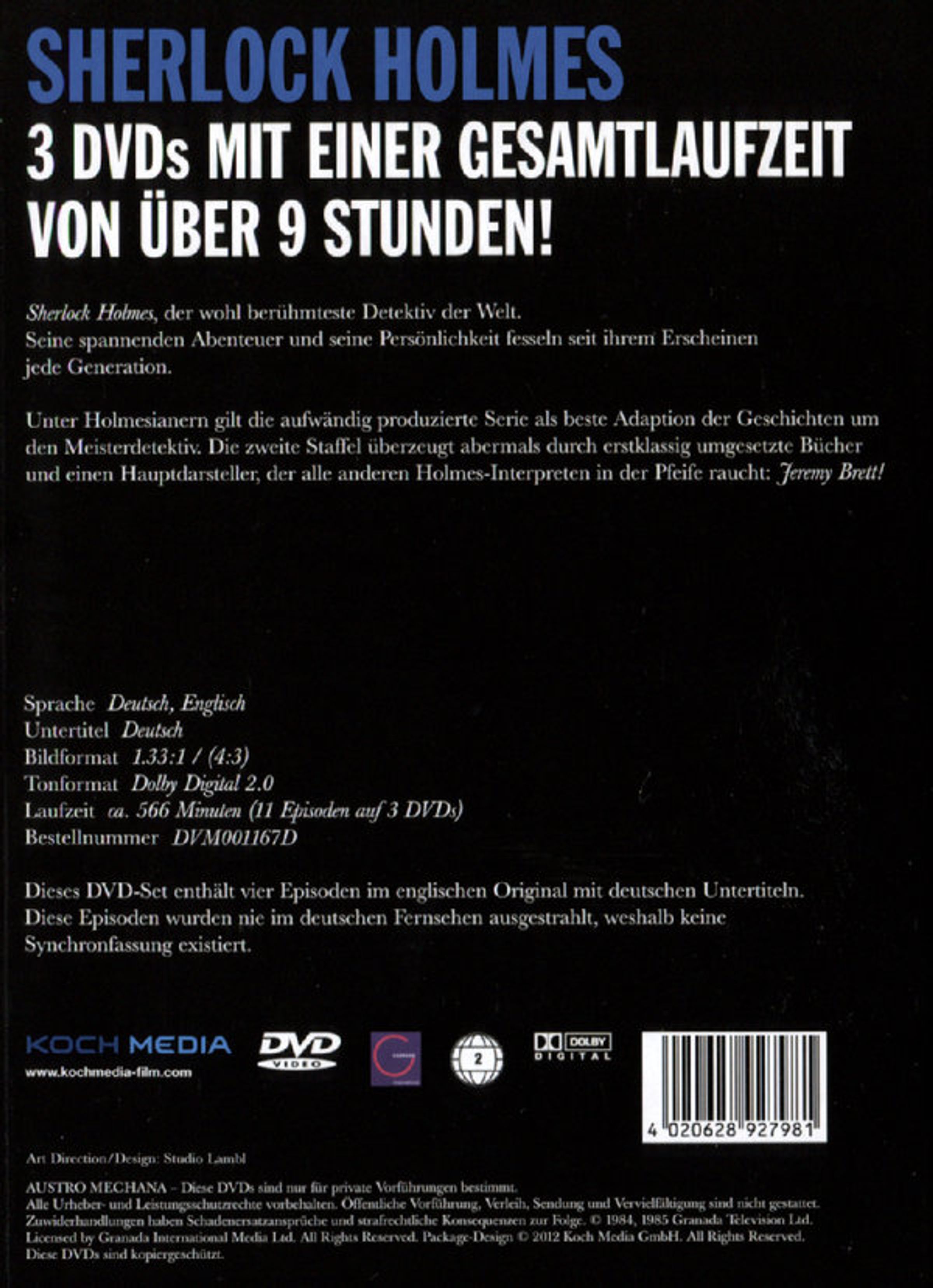 Unter Holmesianern gilt die aufwändig produzierte Serie als beste Adaption der Geschichte um den Meisterdetektiv. Die 2. Staffel der legendären TV-Serie überzeugt abermals durch erstklassig umgesetzte Bücher und einen Hauptdarsteller, der alle anderen Holmes-Interpreten in der Pfeife raucht: Jeremy Brett.