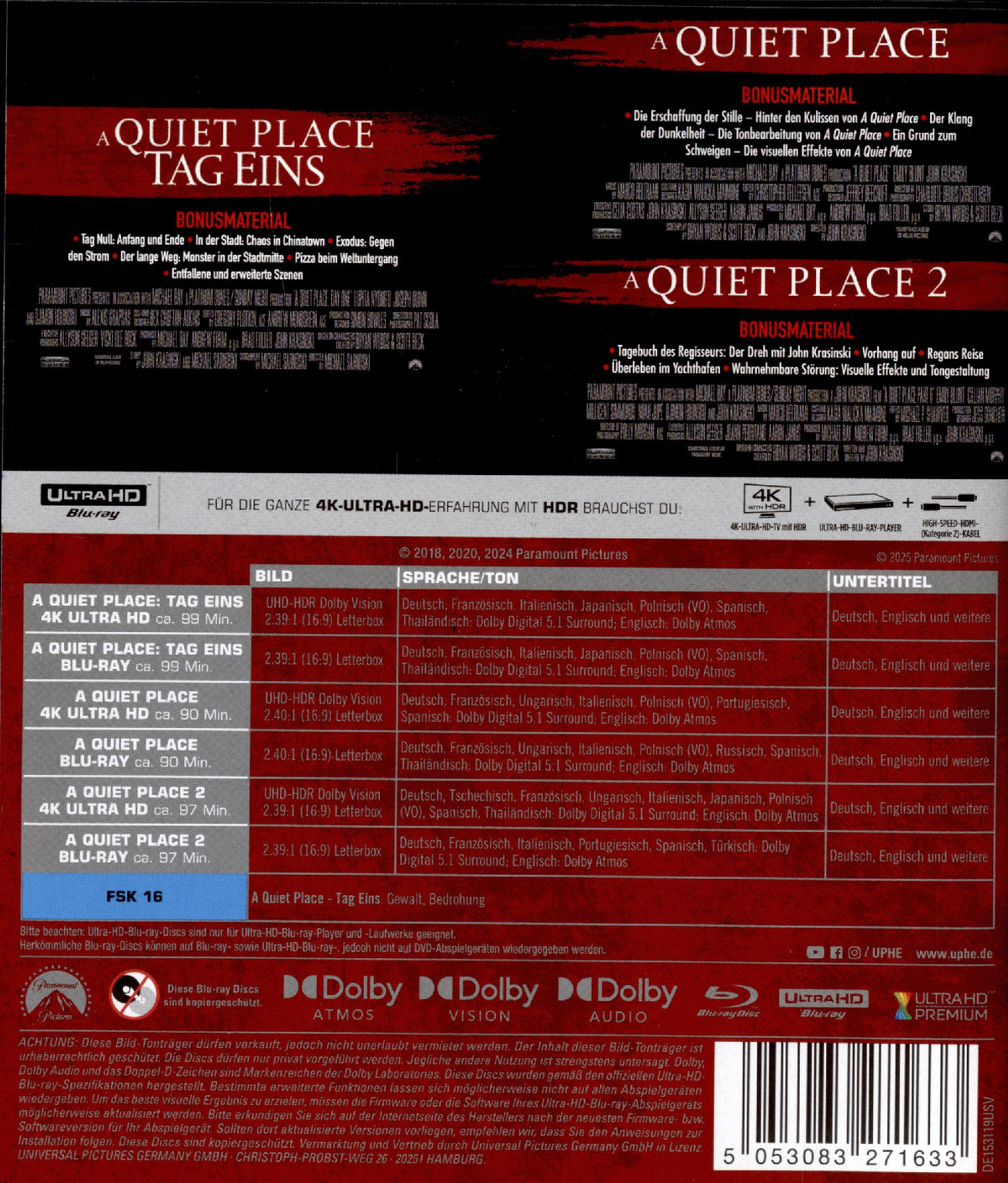 Diese Collection enthält 3 Filme: "A Quiet Place", "A Quiet Place 2", "A Quiet Place: Tag Eins".A Quiet PlaceNur absolute Stille kann eine Familie vorm sicheren Tod bewahren. Mysteriöse, von kleinsten Geräuschen angelockte Kreaturen jagen die einzigen Überlebenden einer unheimlichen Invasion. Evelyn (Emily Blunt) und Lee (John Krasinski) wissen, selbst das leiseste Flüstern oder das Knarzen einer Schuhsohle kann das Ende bedeuten. Fest entschlossen, ihre Kinder um jeden Preis zu schützen, beginnen sie einen verzweifelten Kampf gegen einen übermächtigen Gegner. A Quiet Place 2Die tödliche Gefahr durch die ebenso grausamen wie geräuschempfindlichen Kreaturen ist noch immer allgegenwärtig. Jeder noch so kleine Laut könnte ihr letzter sein. Evelyn ist mit ihren Kindern Regan (Millicent Simmonds), Marcus (Noah Jupe) und dem Baby nun auf sich allein gestellt. Weiterhin muss die Familie ihren Alltag in absoluter Stille bestreiten. Als sie gezwungen sind, sich auf den Weg in das Unbekannte aufzumachen, merken sie schnell, dass hinter jeder Abzweigung weitere Gefahren lauern. Eine lautlose Jagd beginnt …A Quiet Place: Tag EinsEin einfacher Ausflug nach New York wird für die schwerkranke Samira (Lupita Nyong'o) zu einem schrecklichen Albtraum. Mysteriöse Kreaturen lauern in den Schatten der stillen Straßen und jagen erbarmungslos jedes Geräusch. Gemeinsam mit ihrem treuen Kater Frodo und einem unerwarteten Verbündeten (Joseph Quinn) muss sich Samira durch eine...