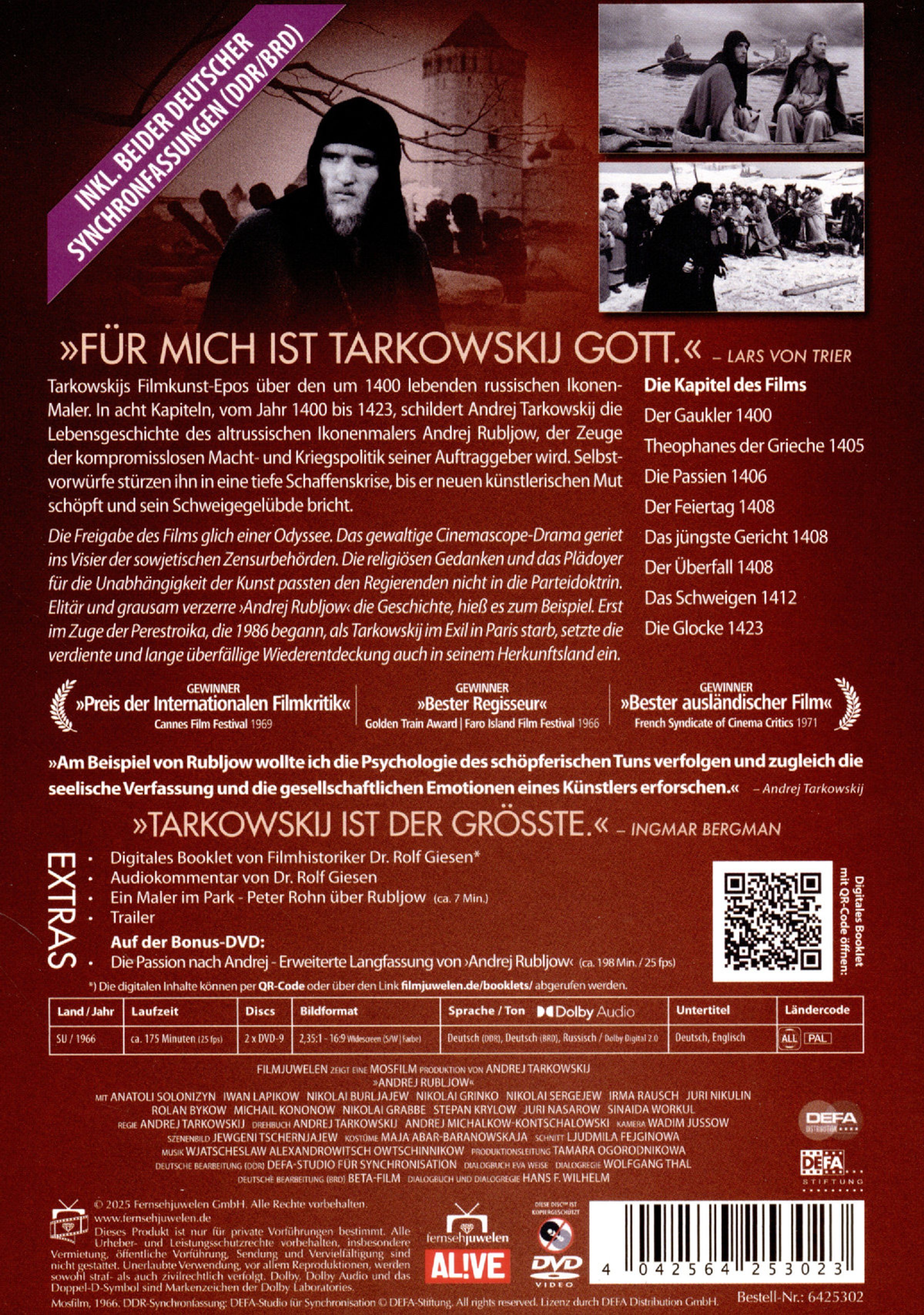 - + Bonus-DVD: Die Passion nach Andrej - Erweiterte Langfassung von ›Andrej Rubljow‹ (ca. 198 Min. / 25 fps) (mit englischen Untertiteln)