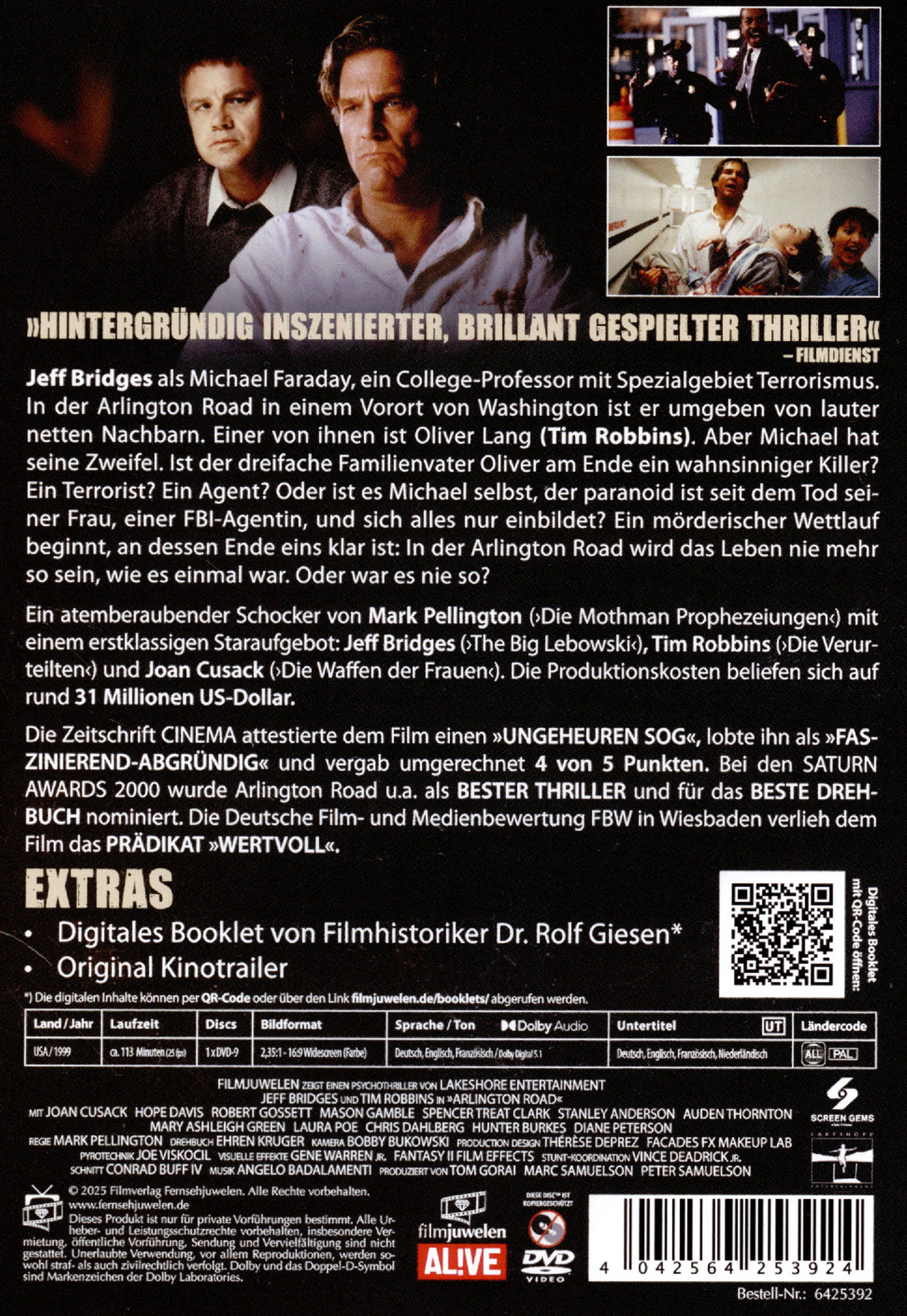 Jeff Bridges als Michael Faraday, ein College-Professor mit Spezialgebiet Terrorismus. In der Arlington Road in einem Vorort von Washington, D.C. ist er umgeben von lauter netten Nachbarn. Einer von ihnen ist Oliver Lang. Aber Michael hat seine Zweifel. Ist der dreifache Familienvater Oliver am Ende ein wahnsinniger Killer? Ein Terrorist? Ein Agent? Oder ist es Michael selbst, der paranoid ist seit dem Tod seiner Frau, einer FBI-Agentin, und sich alles nur einbildet? Ein mörderischer Wettlauf beginnt, an dessen Ende eins klar ist: In der Arlington Road wird das Leben nie mehr so sein, wie es einmal war.