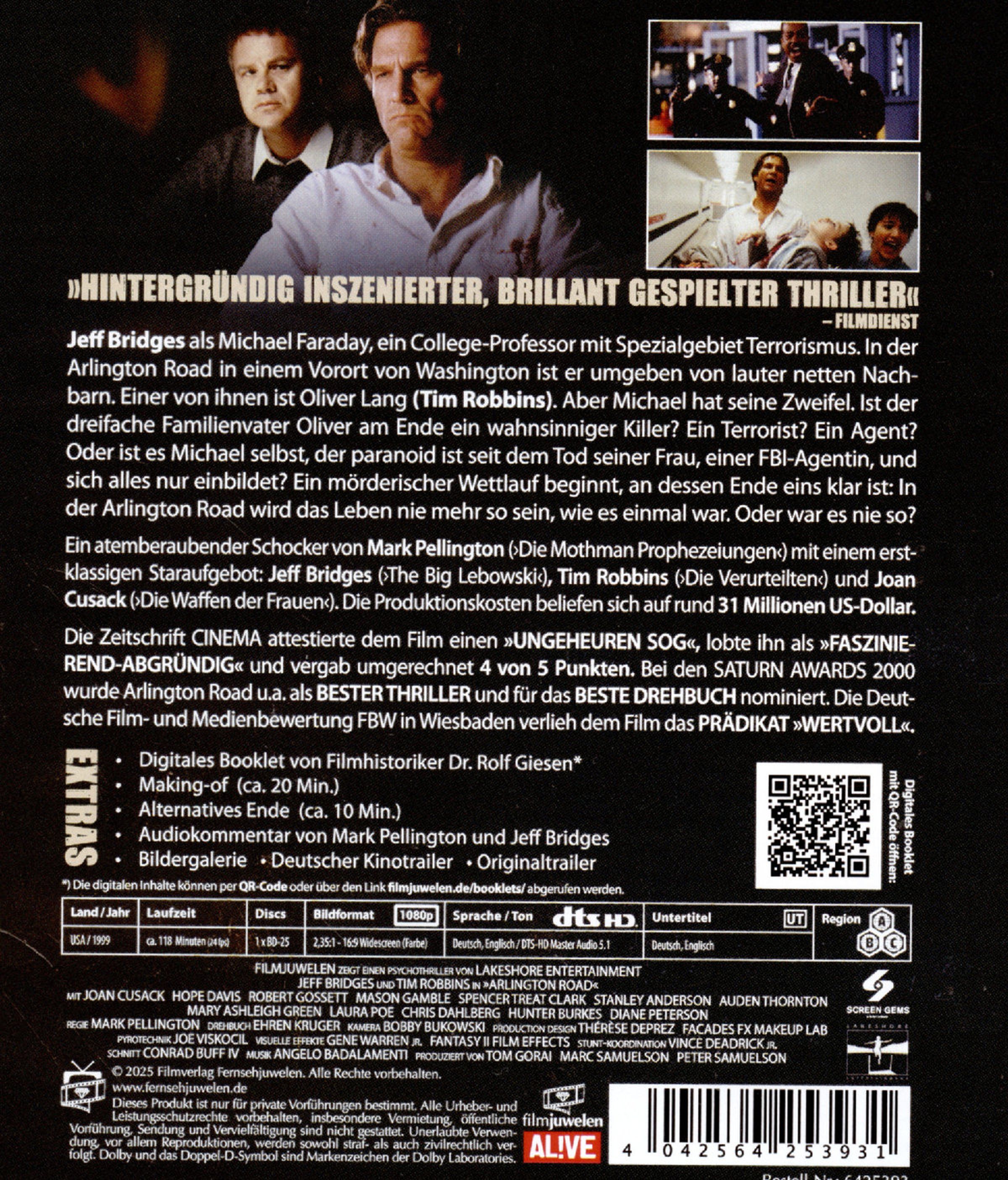 Jeff Bridges als Michael Faraday, ein College-Professor mit Spezialgebiet Terrorismus. In der Arlington Road in einem Vorort von Washington, D.C. ist er umgeben von lauter netten Nachbarn. Einer von ihnen ist Oliver Lang. Aber Michael hat seine Zweifel. Ist der dreifache Familienvater Oliver am Ende ein wahnsinniger Killer? Ein Terrorist? Ein Agent? Oder ist es Michael selbst, der paranoid ist seit dem Tod seiner Frau, einer FBI-Agentin, und sich alles nur einbildet? Ein mörderischer Wettlauf beginnt, an dessen Ende eins klar ist: In der Arlington Road wird das Leben nie mehr so sein, wie es einmal war.
