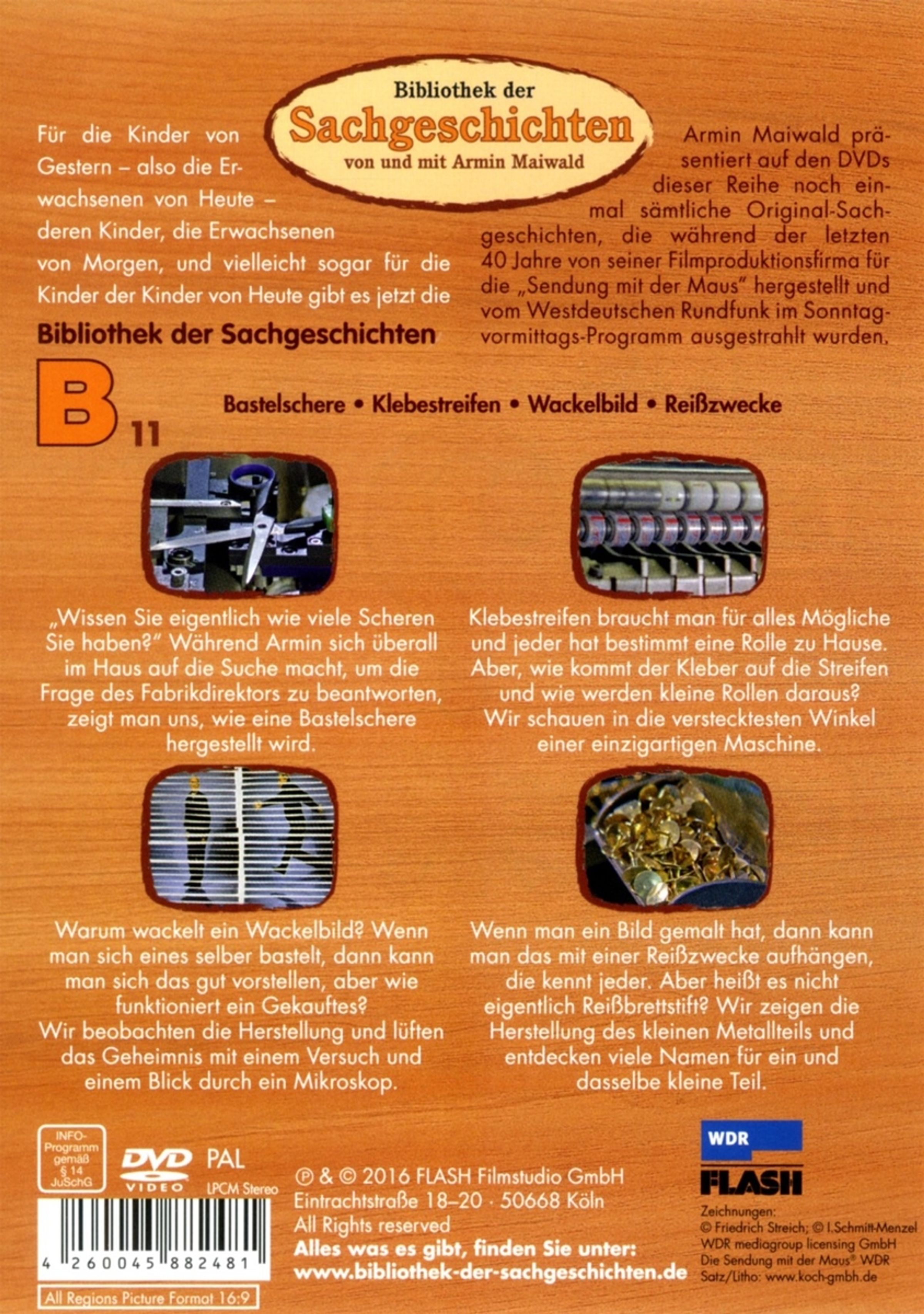 Armin erklärt, wie eine Bastelschere hergestellt wird. Und, wie werden eigentlich die Kleberollen gemacht? Wie kommt da der Kleber drauf und wie werden daraus kleine Rollen? Wie funktioniert ein Wackelbild? Armin beobachtet die Herstellung und lüftet das Geheimnis mit einem Versuch und einem Blick durch ein Mikroskop. Jeder kennt sie: die Reiß- oder Heftzwecke. Aber wie wird sie hergestellt?