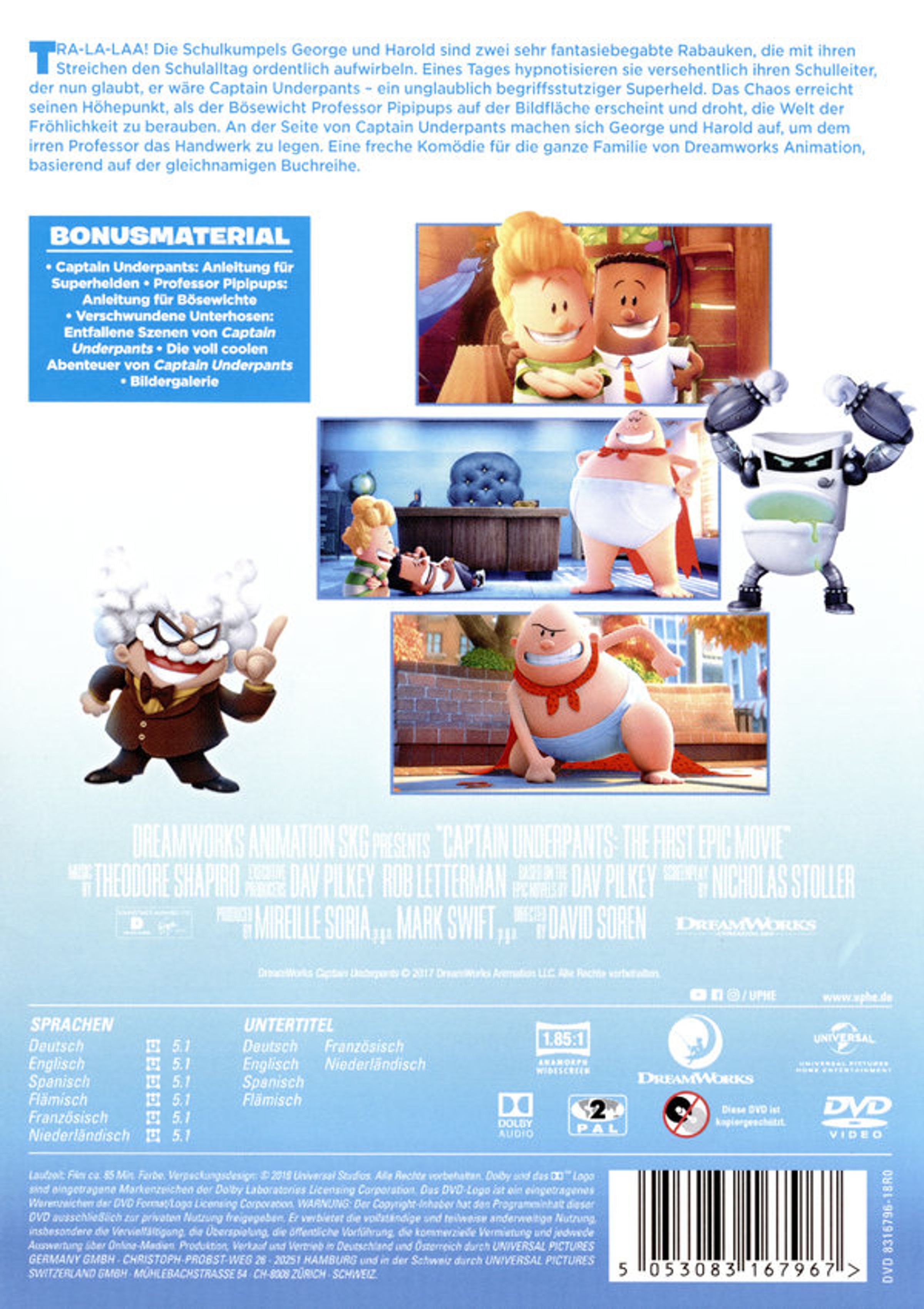 Die Schulfreunde George und Harold sind zwei sehr fantasiebegabte Rabauken, die mit ihren Streichen den Schulalltag ordentlich aufwirbeln. Eines Tages hypnotisieren sie versehentlich ihren Schulleiter, der nun glaubt, er wäre Captain Underpants - ein unglaublich begriffsstutziger Superheld. Das Chaos erreicht seinen Höhepunkt, als der Bösewicht Professor Pippipups auf der Bildfläche erscheint und droht, die Welt der Fröhlichkeit zu berauben. An der Seite von Captain Underpants machen sich Harold und George auf, um dem verrückten Professor das Handwerk zu legen.