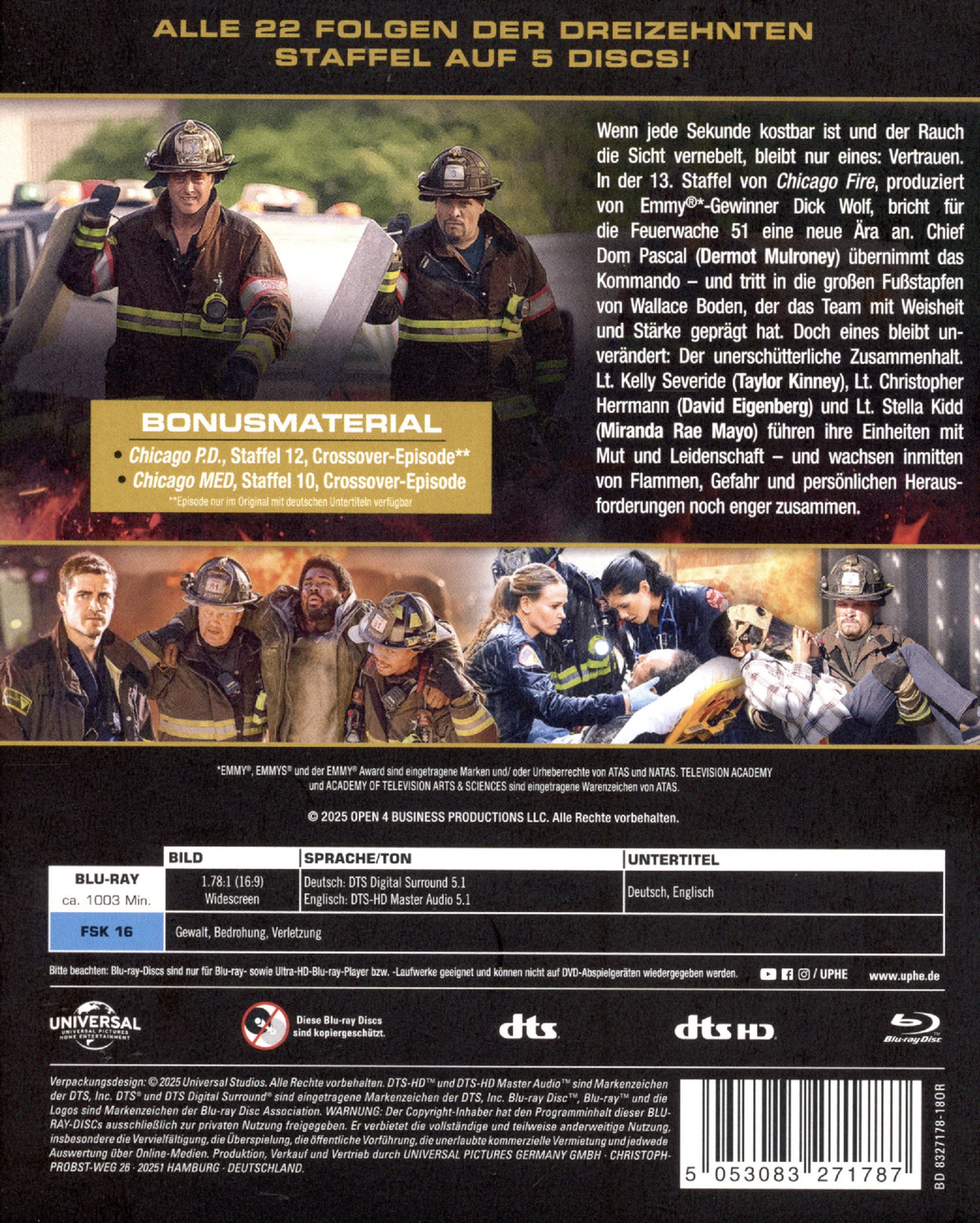 In der 13. Staffel von »Chicago Fire«, produziert von Emmy®-Gewinner Dick Wolf, bricht für Feuerwache 51 eine neue Ära an. Chief Dom Pascal übernimmt das Kommando - und tritt in die großen Fußstapfen von Wallace Boden, der das Team mit Weisheit und Stärke geprägt hat. Doch eines bleibt unverändert: Der unerschütterliche Zusammenhalt. Lt. Kelly Severide, Lt. Christopher Herrmann und Lt. Stella Kidd führen ihre Einheiten mit Mut und Leidenschaft - und wachsen inmitten von Flammen, Gefahr und persönlichen Herausforderungen noch enger zusammen.