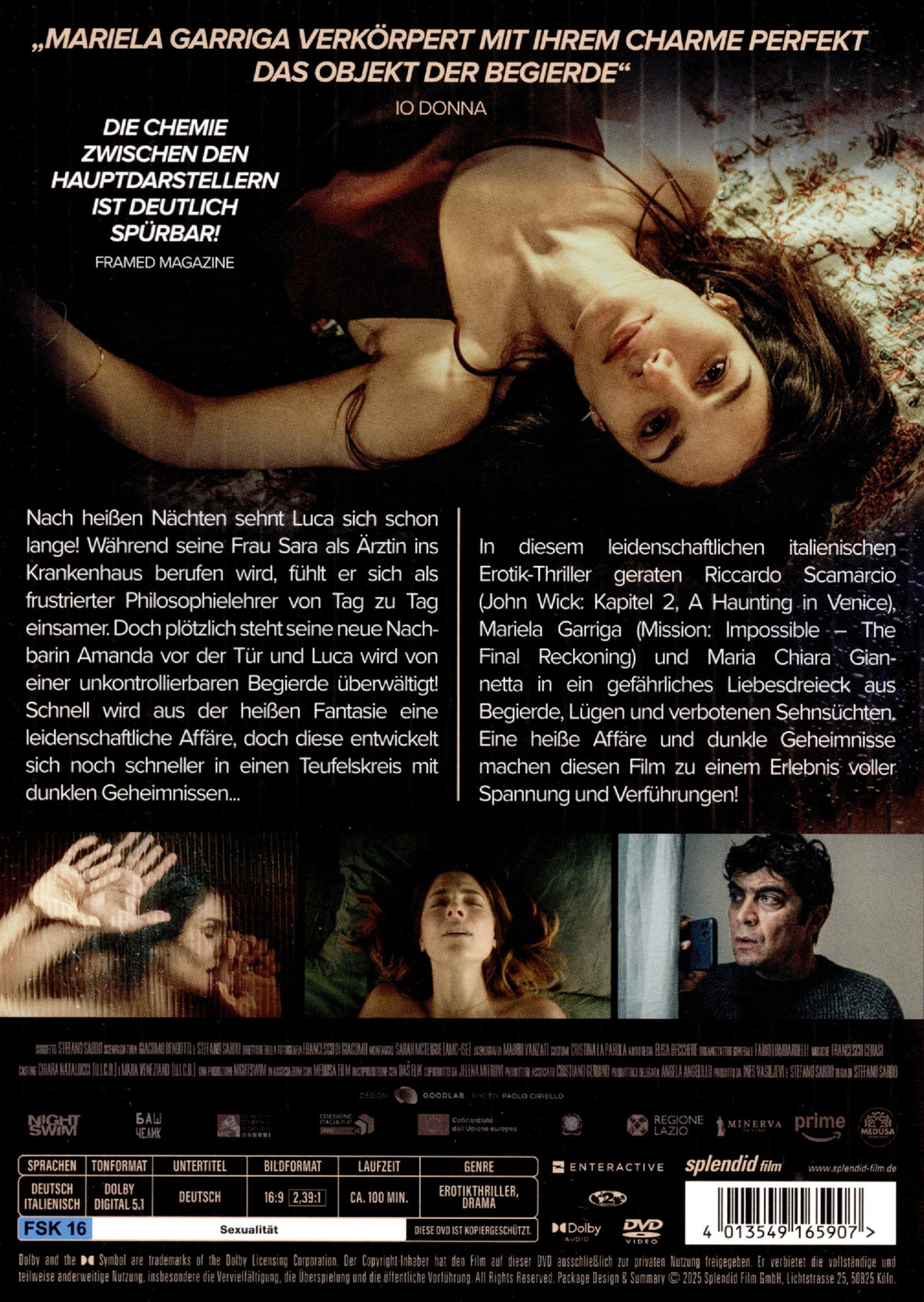 Nach heißen Nächten sehnt Luca sich schon lange! Während seine Frau Sara als Ärztin ins Krankenhaus berufen wird, fühlt er sich als frustrierter Philosophielehrer von Tag zu Tag einsamer. Doch plötzlich steht seine neue Nachbarin Amanda vor der Tür und Luca wird von einer unkontrollierten Begierde überwältigt! Schnell wird aus der heißen Fantasie eine leidenschaftliche Affäre, doch diese entwickelt sich noch schneller in einen Teufelskreis mit dunklen Geheimnissen...