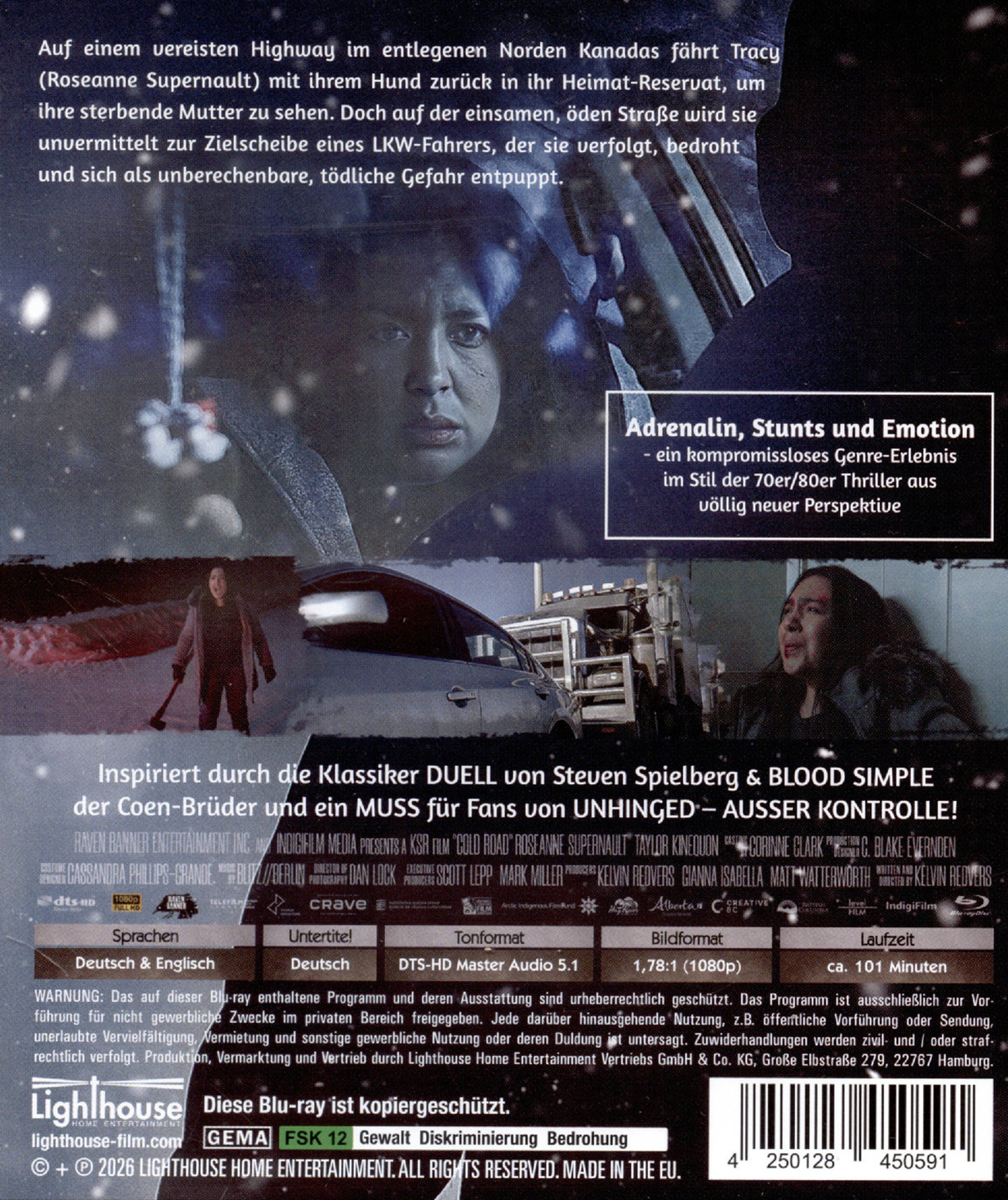 Titel: "COLD ROAD – EISKALTE RACHE". Person im Schnee vor einem großen Lastwagen mit Axt in der Hand., Blu-ray Disc