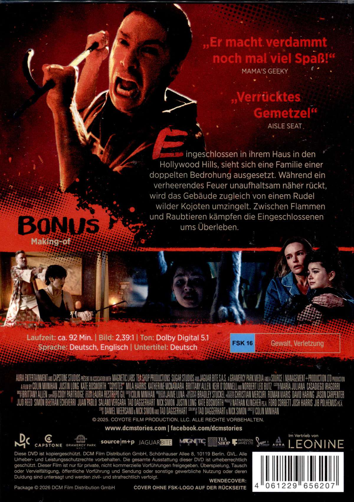 In ihrem Haus in den Hollywood Hills eingeschlossen, sieht sich eine Familie einer doppelten Bedrohung ausgesetzt. Während ein verheerendes Feuer unaufhaltsam näher rückt, wird das Gebäude zugleich von einem Rudel wilder Kojoten umzingelt. Zwischen Flammen und Raubtieren kämpfen die Eingeschlossenen ums Überleben.