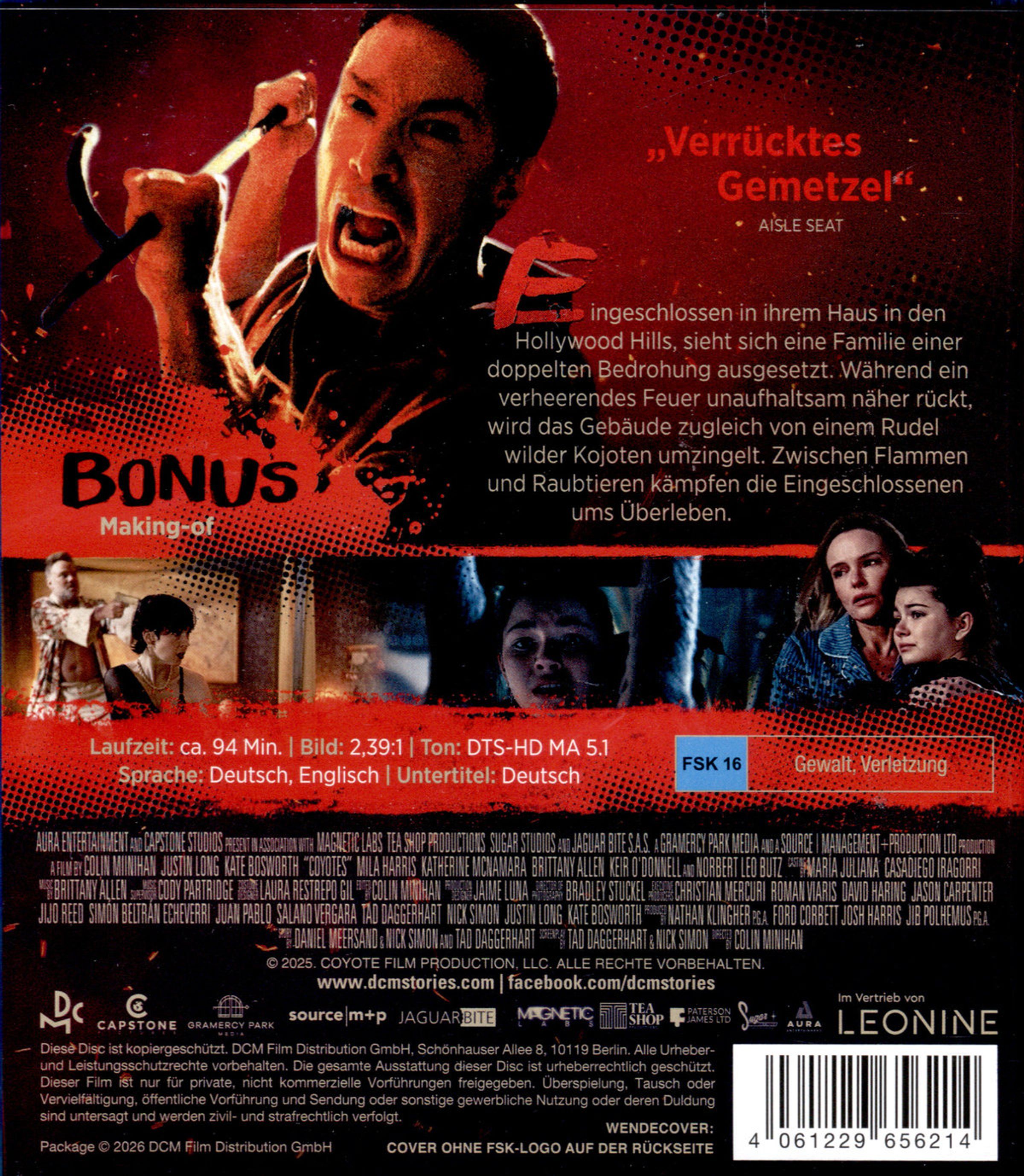 "COYOTES" in roten, zerkratzten Buchstaben vor einem bedrohlichen Tier mit blutiger Schnauze. Darunter zwei ernste Personen., Blu-ray Disc