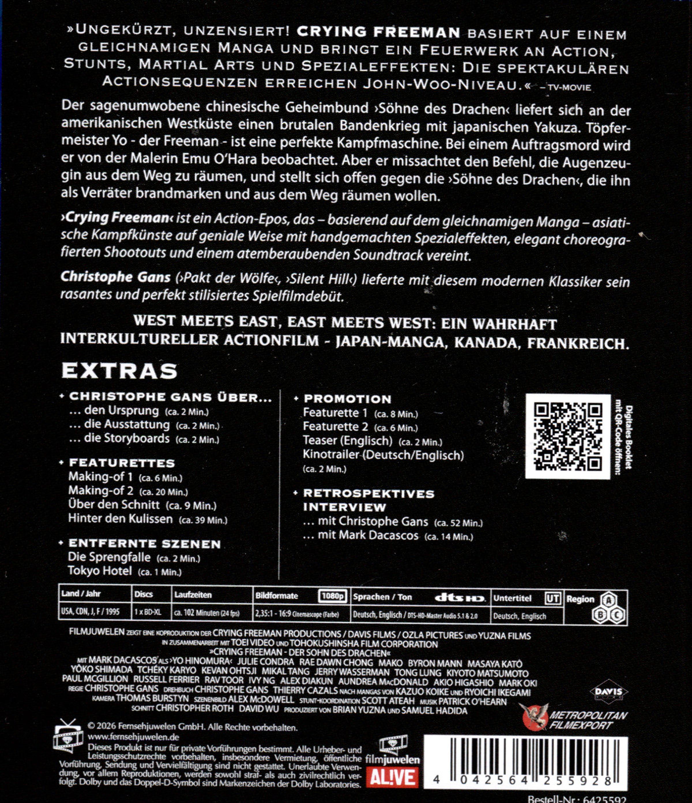 »Crying Freeman« ist ein Action-Epos, das - basierend auf dem gleichnamigen Manga - asiatische Kampfkünste auf geniale Weise mit handgemachten Spezialeffekten, elegant choreografierten Shoot-Outs und einem atemberaubenden Soundtrack vereint. Christophe Gans lieferte mit diesem modernen Klassiker sein rasantes und perfekt stilisiertes Spielfilmdebüt.