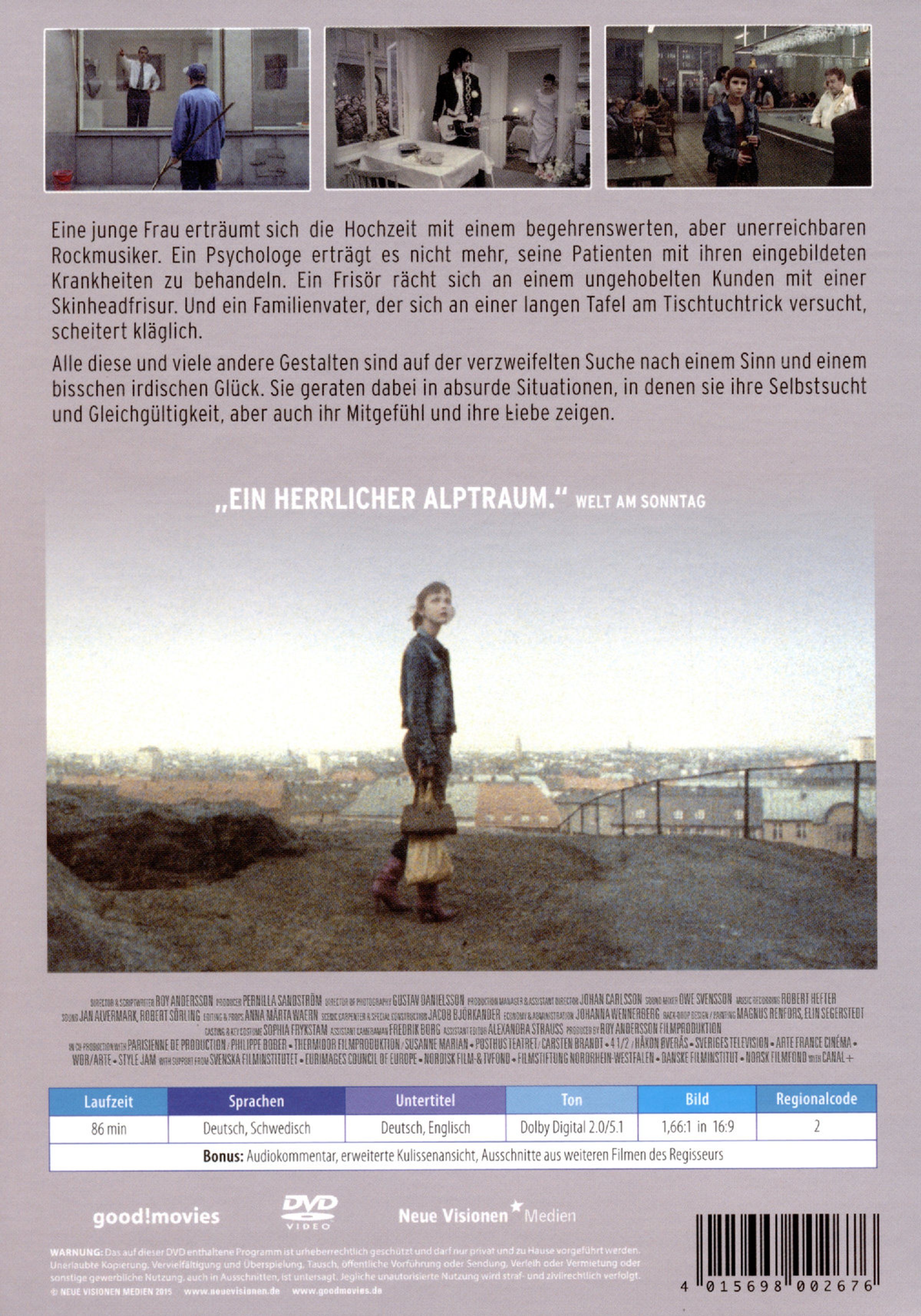 "Roy Andersson entfaltet groteske Szenen des Alltags, die einem, ohne lange an der Schädeldecke anzuklopfen, schnurstracks in die Träume gehen. Schön verrückt." (Der Tagesspiegel)
