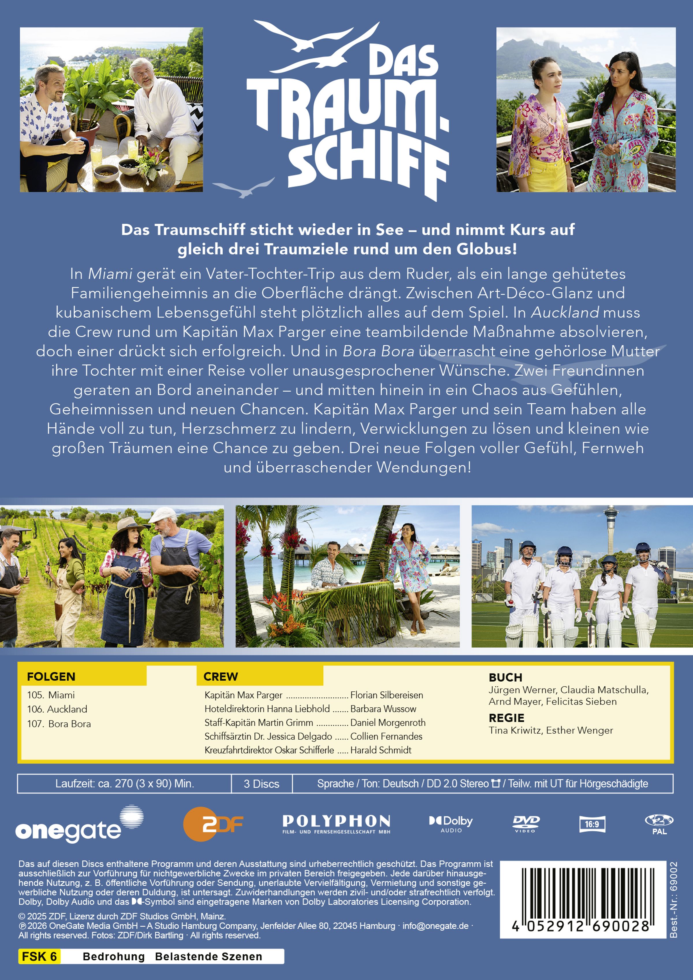 Das Traumschiff sticht wieder in See - und nimmt Kurs auf gleich drei Traumziele rund um den Globus! In Miami gerät ein Vater-Tochter-Trip aus dem Ruder, als ein lange gehütetes Familiengeheimnis an die Oberfläche drängt. Zwischen Art-Déco-Glanz und kubanischem Lebensgefühl steht plötzlich alles auf dem Spiel. In Auckland erwartet die Crew nicht nur ein Wiedersehen mit alten Bekannten, sondern auch ein dramatischer Zwischenfall bei einem Maori-Ritual stellt die Reise auf den Kopf. Und auf Bora Bora, der Südseeperle, geht ein Heiratsantrag schief - oder vielleicht genau richtig?