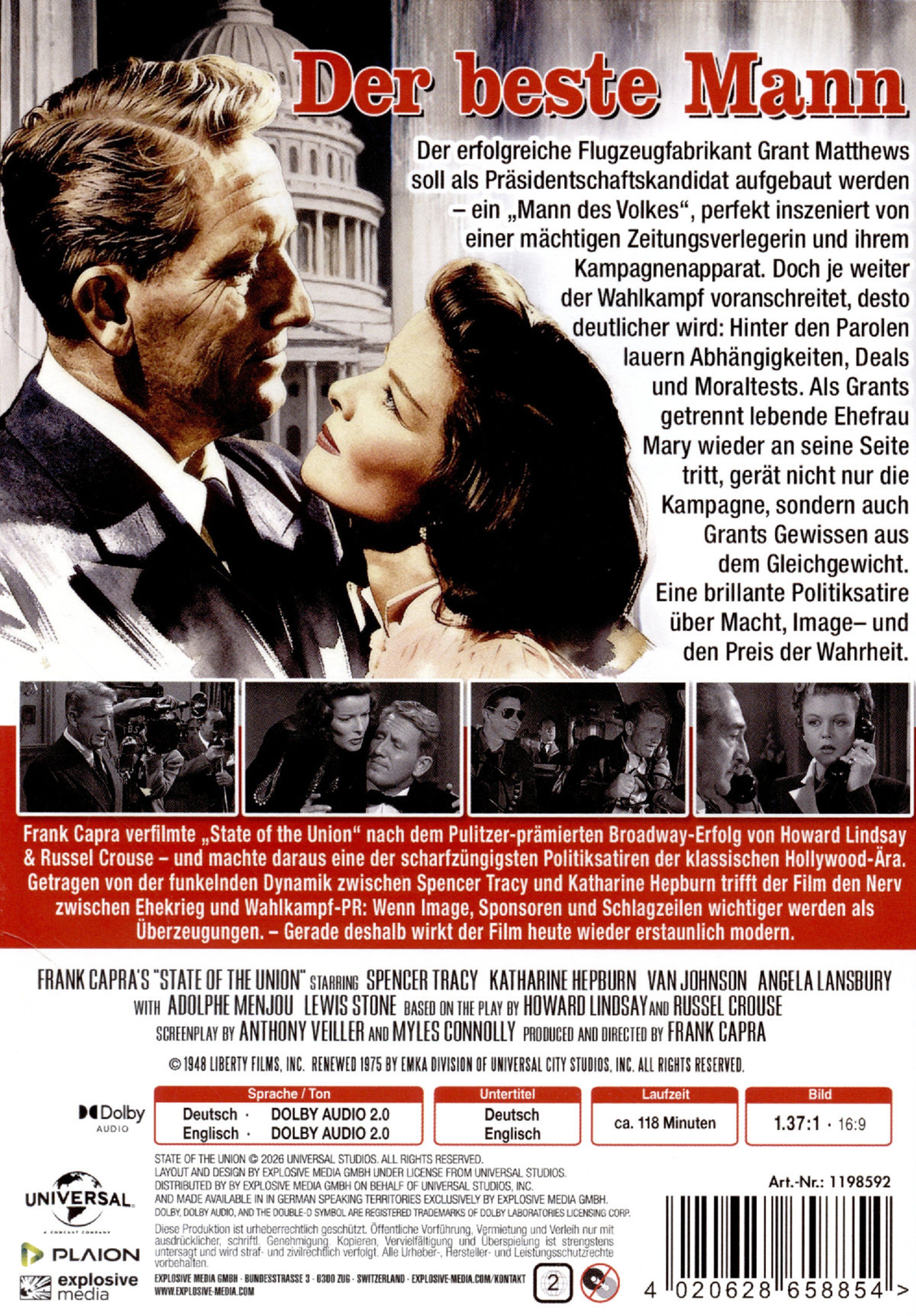 Frank Capra inszeniert ein scharf beobachtetes Drama, das politische Mechanismen entlarvt und zugleich ein intimes Porträt einer Ehe unter öffentlichem Druck zeichnet. »Der beste Mann« ist ein pointierter, zugleich überraschend persönlicher Politfilm von Frank Capra, der seine Idealvorstellungen von Demokratie und moralischer Integrität auf elegante Weise verhandelt. Spencer Tracy überzeugt als Industrieller Grant Matthews, der wider Willen in den Präsidentschaftswahlkampf gerät und zunehmend zwischen politischem Kalkül und persönlicher Überzeugung zerrieben wird. Tracy spielt diese innere Zerrissenheit mit großer Ruhe, Autorität und menschlicher Wärme. Ein besonderer Reiz des Films liegt im Zusammenspiel von Tracy und Katharine Hepburn, deren scharfzüngige, unabhängige Ehefrau dem Film emotionale Tiefe und intellektuellen Witz verleiht. Die Dialoge sind präzise, intelligent und oft überraschend modern. Capra verbindet politische Satire mit romantischem Drama und zeigt, wie private Beziehungen und öffentliche Moral untrennbar miteinander verwoben sind.