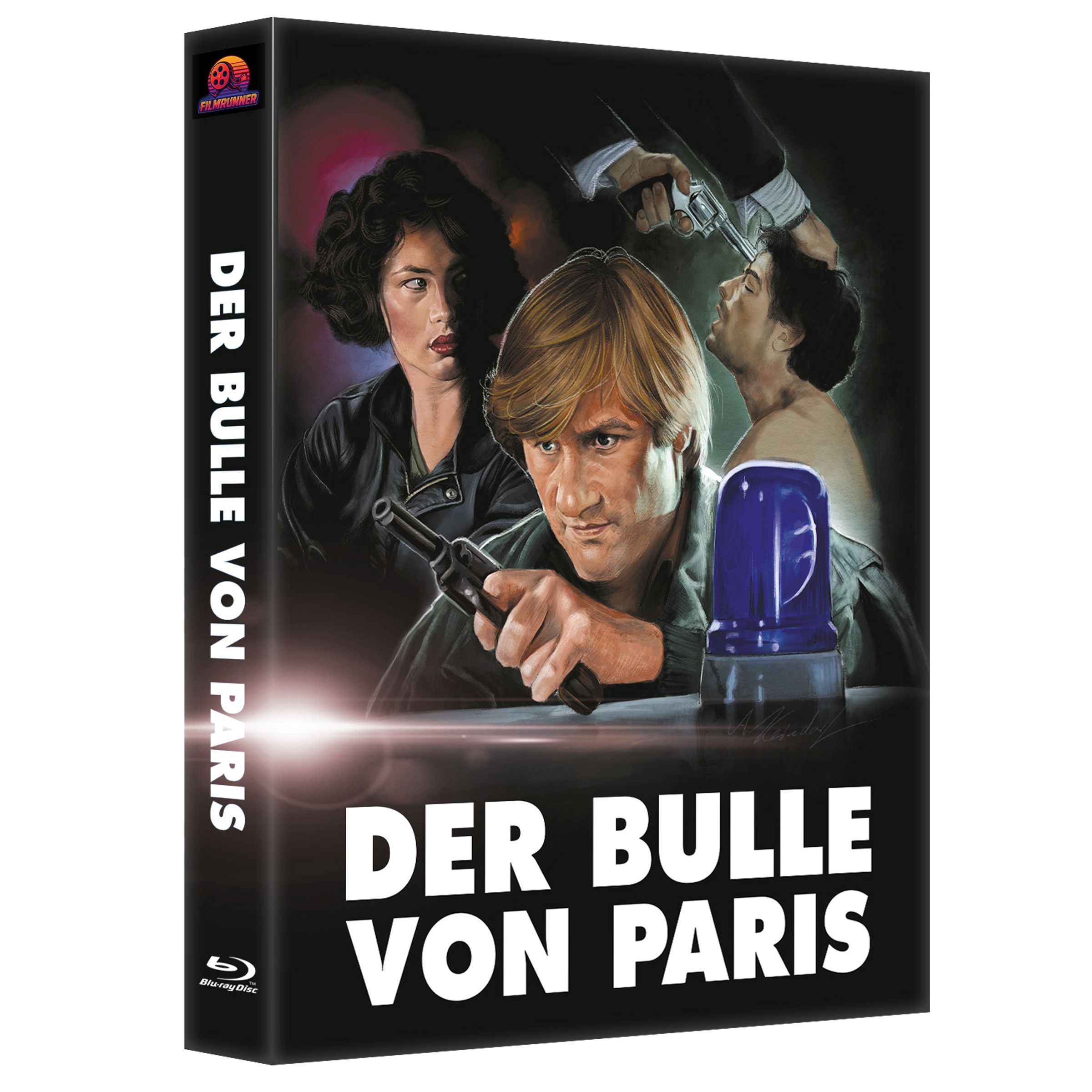 „DER BULLE VON PARIS“ steht groß. Illustration: Mann mit Waffe, Frau im Hintergrund, weitere Szene mit Bedrohung., Blu-ray Disc