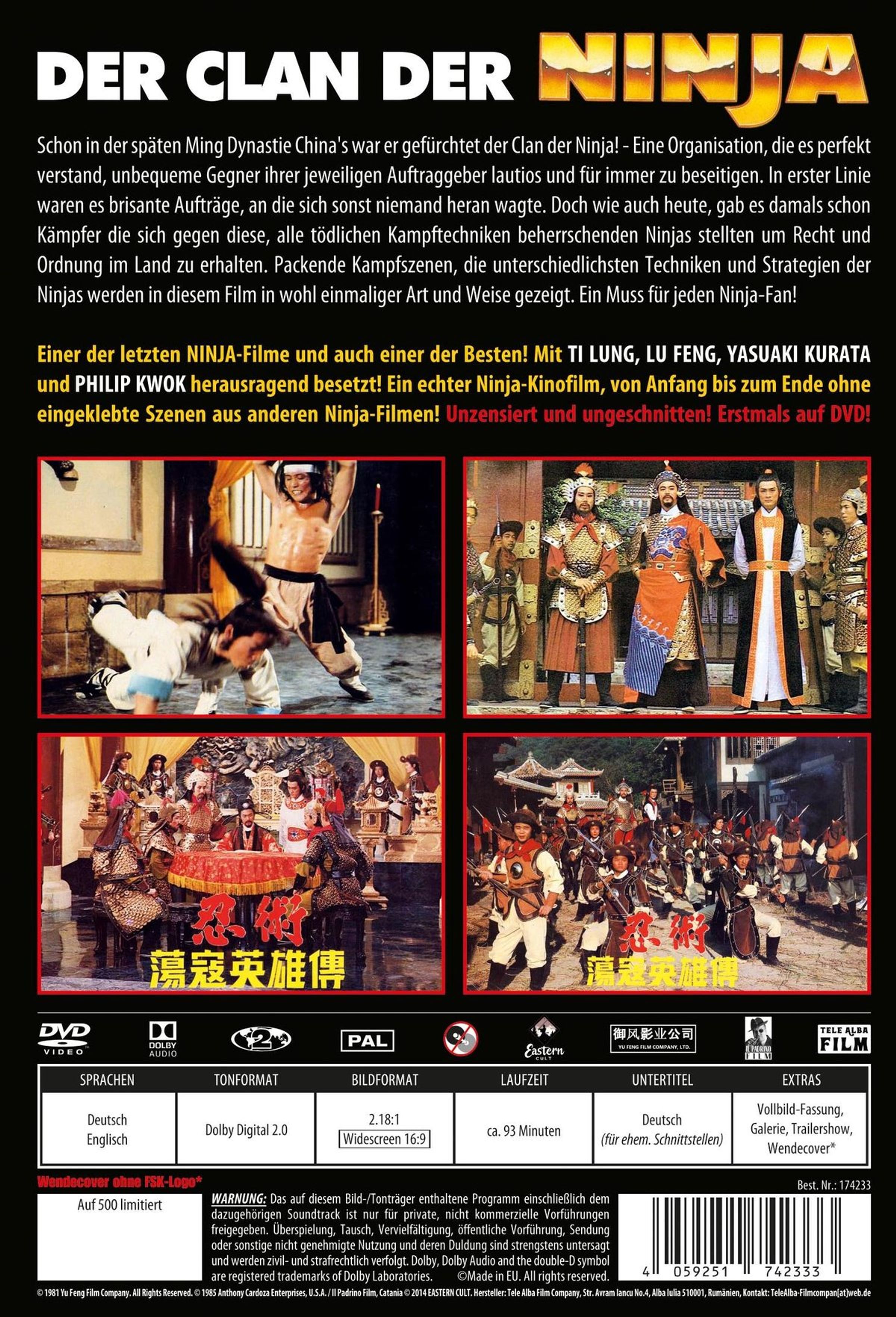Einer der letzten NINJA-Filme und auch einer der Besten! Mit TI LUNG, LU FENG, YASUAKI KURATA und PHILIP KWOK herausragend besetzt! Ein echter Ninja-Kinofilm, von Anfang bis zum Ende ohne eingeklebte Szenen aus anderen Ninja-Filmen! Unzensiert und ungeschnitten! Erstmals auf DVD!