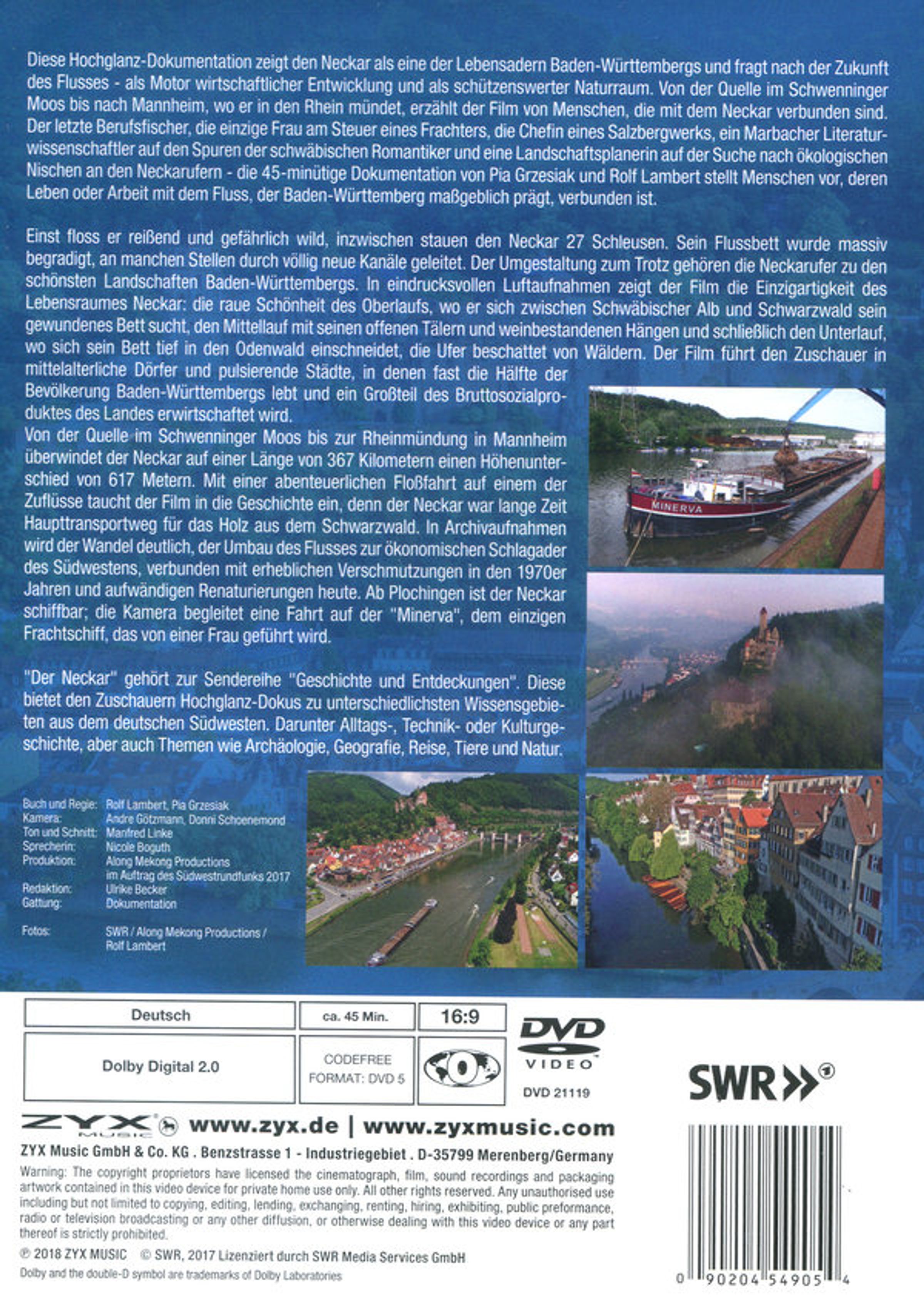Der letzte Berufsfischer, die einzige Frau am Steuer eines Frachters, die Chefin eines Salzbergwerks, ein junger Ingenieur im 246 Meter hohen Testturm für Aufzüge in Rottweil, ein Marbacher Literaturwissenschaftler auf den Spuren der schwäbischen Romantiker und eine Landschaftsplanerin auf der Suche nach ökologischen Nischen an den Neckarufern - die 90-minütige Dokumentation von Pia Grzesiak und Rolf Lambert stellt Menschen vor, deren Leben oder Arbeit mit dem Fluss, der Baden-Württemberg maßgeblich prägt, verbunden ist.