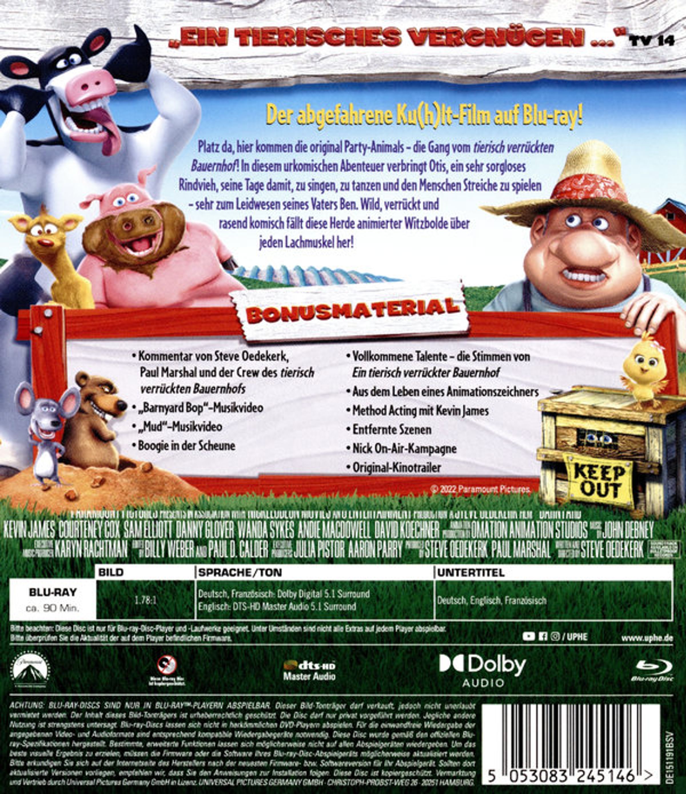 - Kommentar von Steve Oedekerk, Paul Marshal und der Crew des »tierisch verrückten Bauernhofes«: Mud Musikvideo; Boogie in der Scheune; Vollkommene Talente - die Stimmen von »Ein tierisch verrückter Bauernhof«; Aus dem Leben eines Animationszeichners; Method Acting mit Kevin James; Entfernte Szenen; »Barnyard Bop«-Musikvideo; Nick On-Air-Kampagne