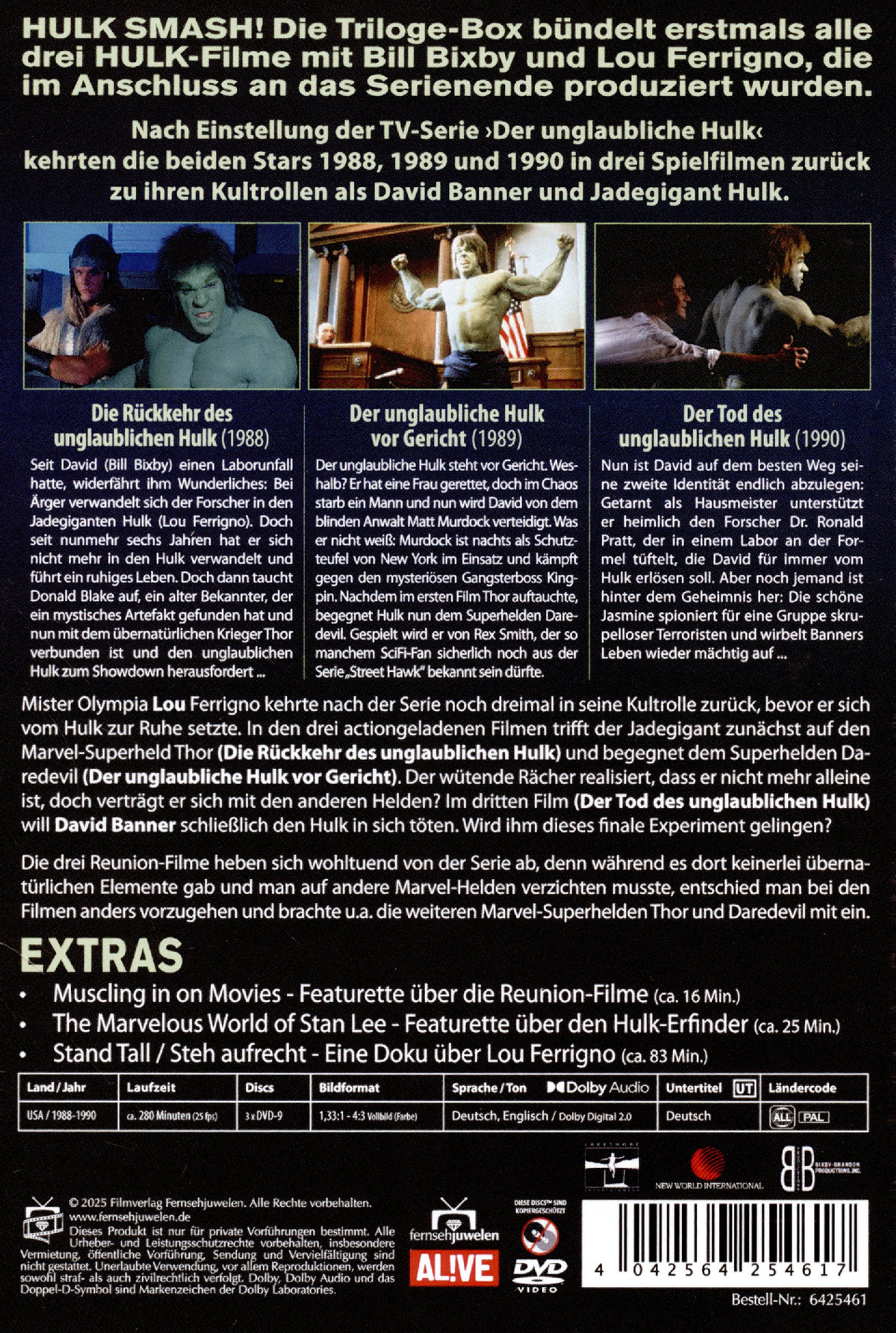Nach Einstellung der TV-Serie »Der unglaubliche Hulk« kehrten Bill Bixby und Lou Ferringo 1988, 1989 und 1990 in drei Spielfilmen zurück zu ihren Kultrollen als David Banner und Jadegigant Hulk. Die Gesamtedition bündelt erstmals alle drei Filme, die nach der Serie entstanden.