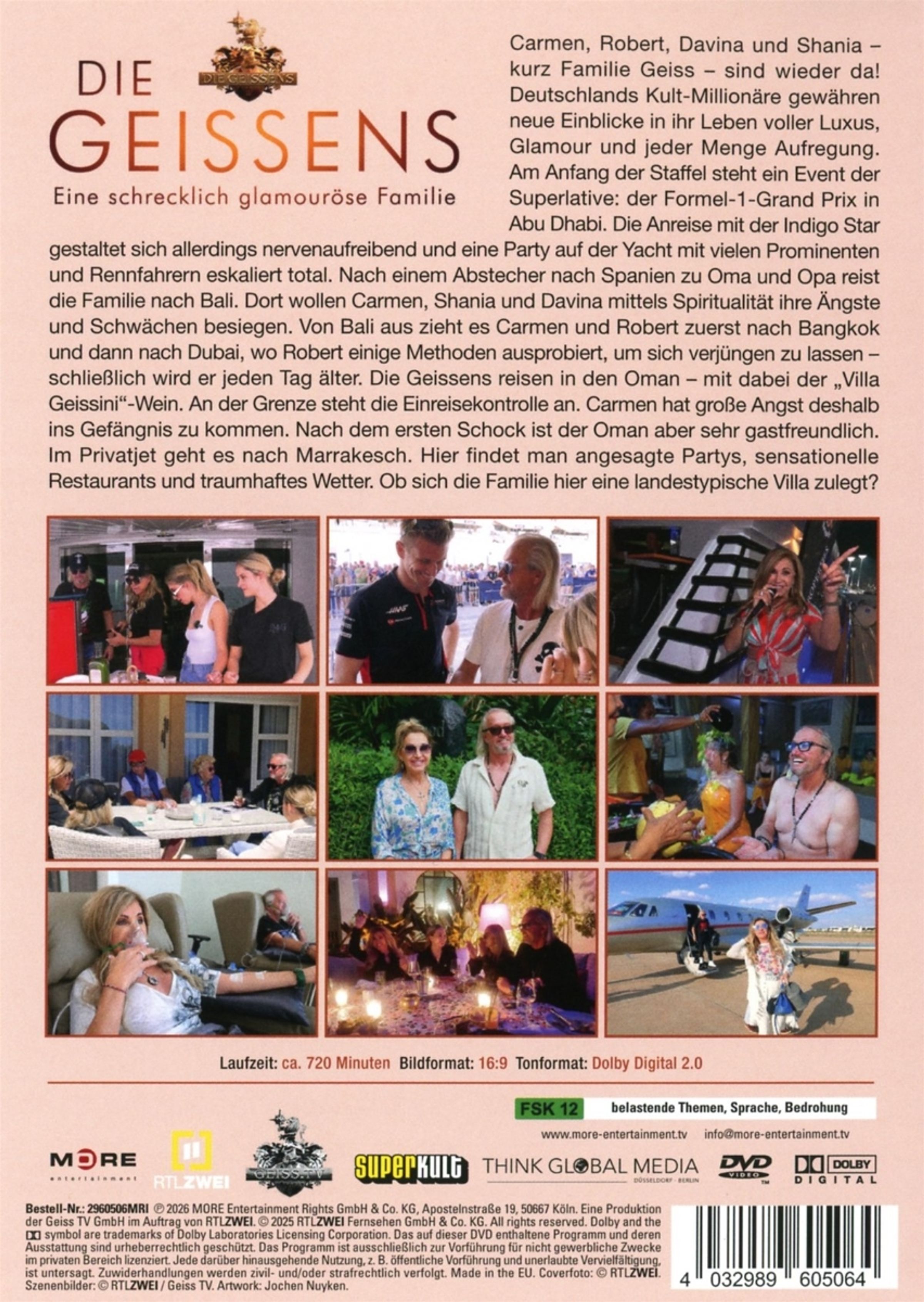 Am Anfang der Staffel steht ein Event der Superlative: der Formel-1-Grand Prix in Abu Dhabi. Die Anreise mit der Indigo Star gestaltet sich allerdings nervenaufreibend und eine Party auf der Yacht mit vielen Prominenten und Rennfahrern eskaliert total. Nach einem Abstecher nach Spanien zu Oma und Opa reist die Familie nach Bali. Dort wollen Carmen, Shania und Davina mittels Spiritualität ihre Ängste und Schwächen besiegen. Von Bali aus zieht es Carmen und Robert zuerst nach Bangkok und dann nach Dubai, wo Robert einige Methoden ausprobiert, um sich verjüngen zu lassen – schließlich wird er jeden Tag älter. Die Geissens reisen in den Oman - mit dabei der »Villa Geissini«-Wein. An der Grenze steht die Einreisekontrolle an. Carmen hat große Angst deshalb ins Gefängnis zu kommen. Nach dem ersten Schock ist der Oman aber sehr gastfreundlich. Im Privatjet geht es nach Marrakesch. Hier findet man angesagte Partys, sensationelle Restaurants und traumhaftes Wetter. Ob sich die Familie hier eine landestypische Villa zulegt?