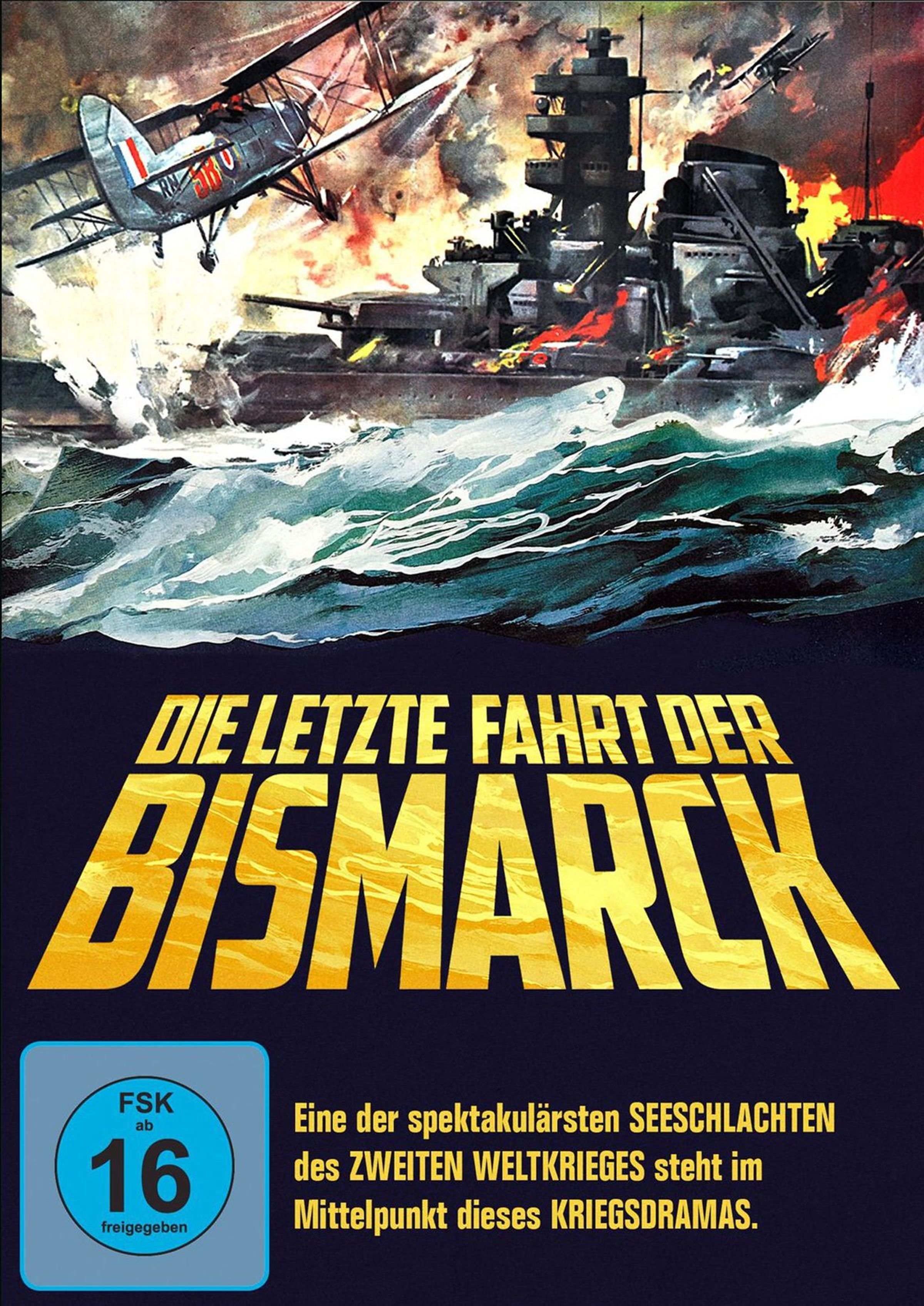 Poster mit Text: "DIE LETZTE FAHRT DER BISMARCK". Illustration zeigt ein Kampfflugzeug über einem brennenden Kriegsschiff., DVD