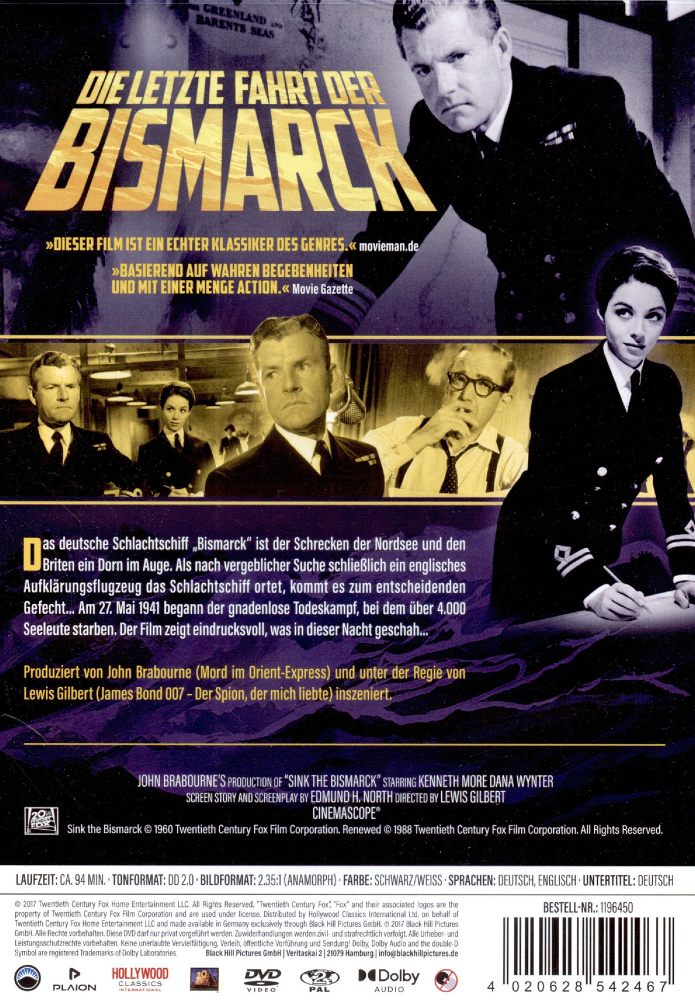 Mit spektakulären Special Effects, seltenen Originalaufnahmen und einer intensiven Inszenierung von Lewis Gilbert, der für seine herausragende Regie gefeiert wurde, fesselt der Film vom ersten Moment an. Er zeigt den entscheidenden Kampf am 27. Mai 1941, bei dem über 4.000 Seeleute ihr Leben verloren, und vereint historische Genauigkeit mit cineastischer Spannung. Nominiert für die Laurel Awards 1960 als bestes Action-Drama, ist dieser Film ein Muss für alle Liebhaber von Geschichte, Spannung und epischem Kino.