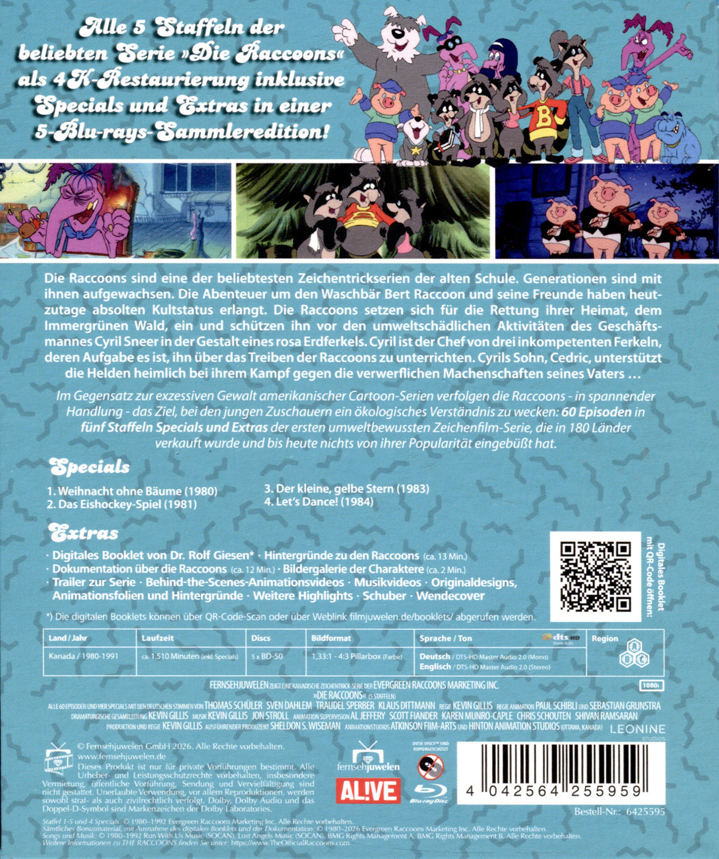 Im Gegensatz zur exzessiven Gewalt amerikanischer Cartoon-Serien verfolgen die Raccoons - in spannender Handlung - das Ziel, bei den jungen Zuschauern ein ökologisches Verständnis zu wecken: 60 Episoden in fünf Staffeln plus vier Specials der ersten umweltbewussten Zeichentrickfilm-Serie, die in 180 Länder verkauft wurde und bis heute nichts von ihrer Popularität eingebüßt hat.