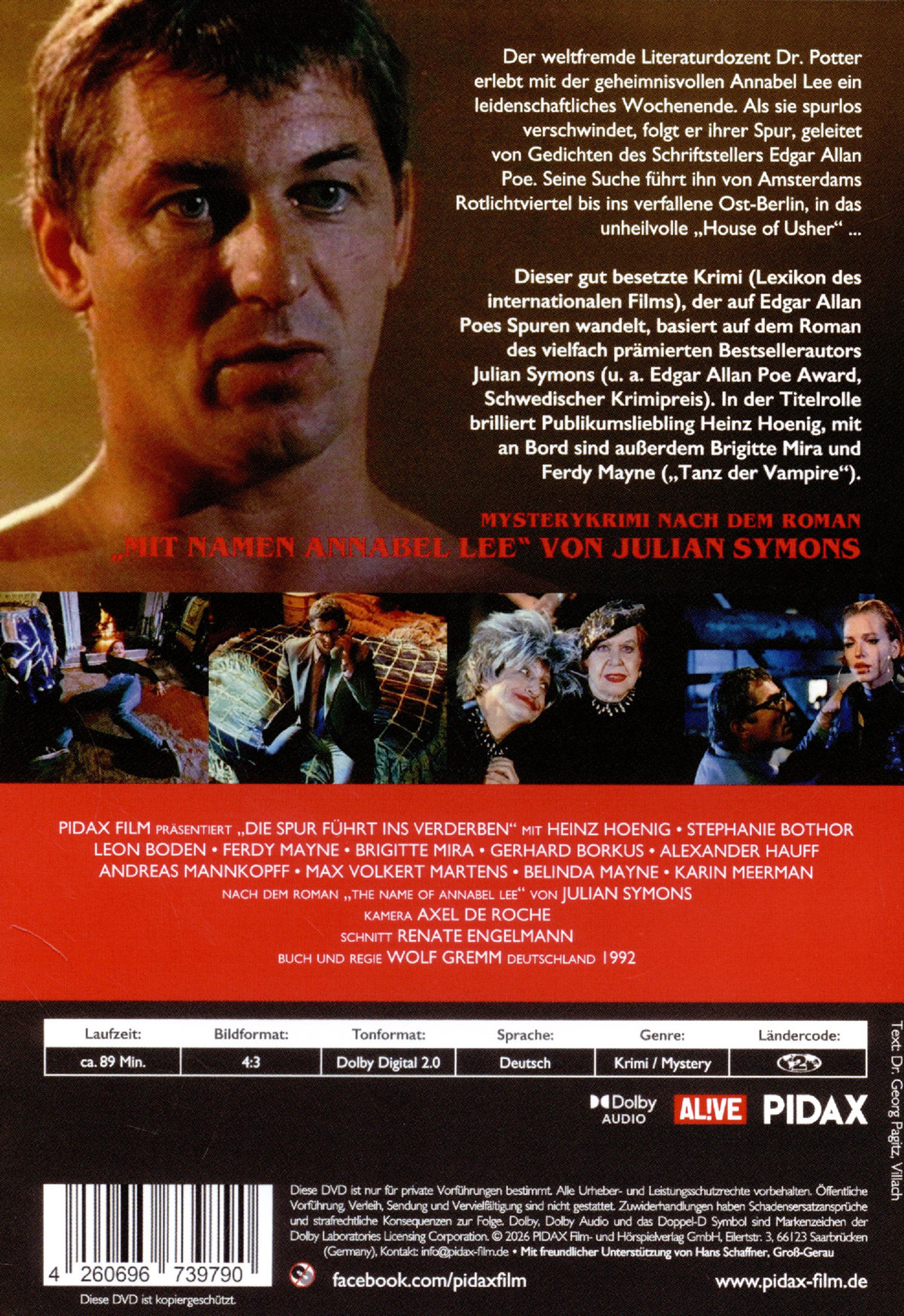 Der weltfremde Literaturdozent Dr. Potter erlebt mit der geheimnisvollen Annabel Lee ein leidenschaftliches Wochenende. Als sie spurlos verschwindet, folgt er ihrer Spur, geleitet von Gedichten des Schriftstellers Edgar Allan Poe. Seine Suche führt ihn von Amsterdams Rotlichtviertel bis ins verfallene Ost-Berlin, in das unheilvolle »House of Usher« ...