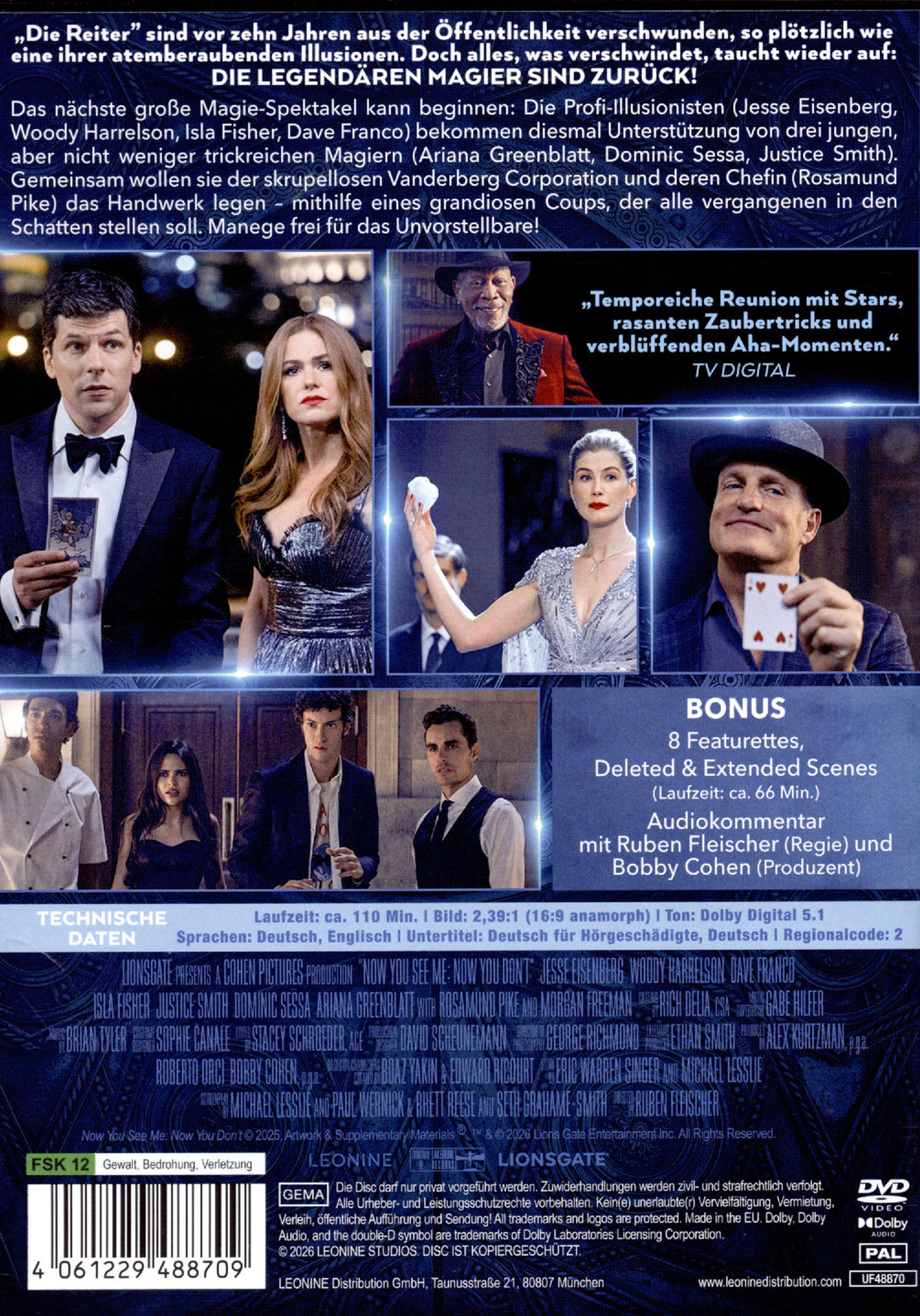 Das nächste große Magie-Spektakel kann beginnen: Die Profi-Illusionisten bekommen diesmal Unterstützung von drei jungen, aber nicht weniger trickreichen Magiern. Gemeinsam wollen sie der skrupellosen Vanderberg Corporation und deren Chefin das Handwerk legen - mithilfe eines grandiosen Coups, der alle vergangenen in den Schatten stellen soll. Manege frei für das Unvorstellbare!