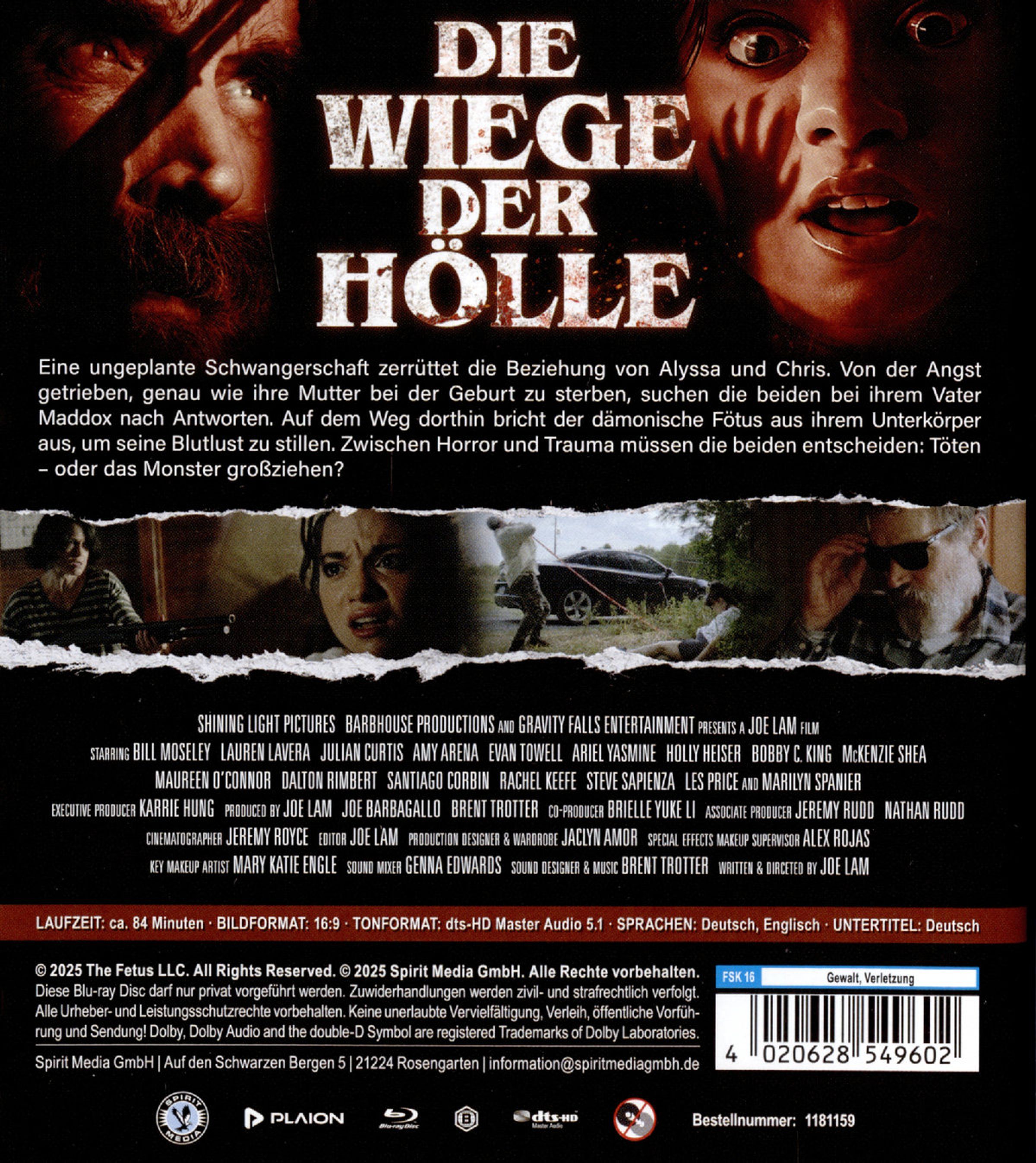 Eine ungeplante Schwangerschaft zerrüttet die Beziehung von Alyssa und Chris. Geplagt von der Angst, so wie ihre Mutter im Kindesbett zu sterben, suchen sie bei ihrem entfremdeten Vater Maddox nach Antworten. Schon auf dem Weg bricht der dämonische Fötus aus ihrem Unterkörper aus, um seine Blutlust zu stillen. Zwischen Horror und Trauma müssen sie und Chris entscheiden: Töten – oder das Monster großziehen? The Fetus ist ein blutgetränkter Horrorfilm, der klassische Praxiseffekte mit moderner Dämonenthematik verbindet. In dem Film in dem sich das ungeborene Kind von Alessa und Chris als blutrünstiger Dämon entpuppt, steht das Paar vor der Entscheidung: Töten – oder das Monster großziehen? Der Film beeindruckt mit Lauren LaVera (Terrifier 2 & 3) und Kult-Horrorstimme Bill Moseley (Texas Chainsaw Massacre 2) in den Hauptrollen. Regisseur Joe Lam setzt auf aufwendige, handgemachte Spezialeffekte von einem preisgekrönten kolumbianischen VFX-Künstler, was dem Film eine rohe, greifbare Intensität verleiht. The Fetus ist kompromisslos, grotesk und genau das Richtige für Fans von kompromisslosem Genre-Horror.