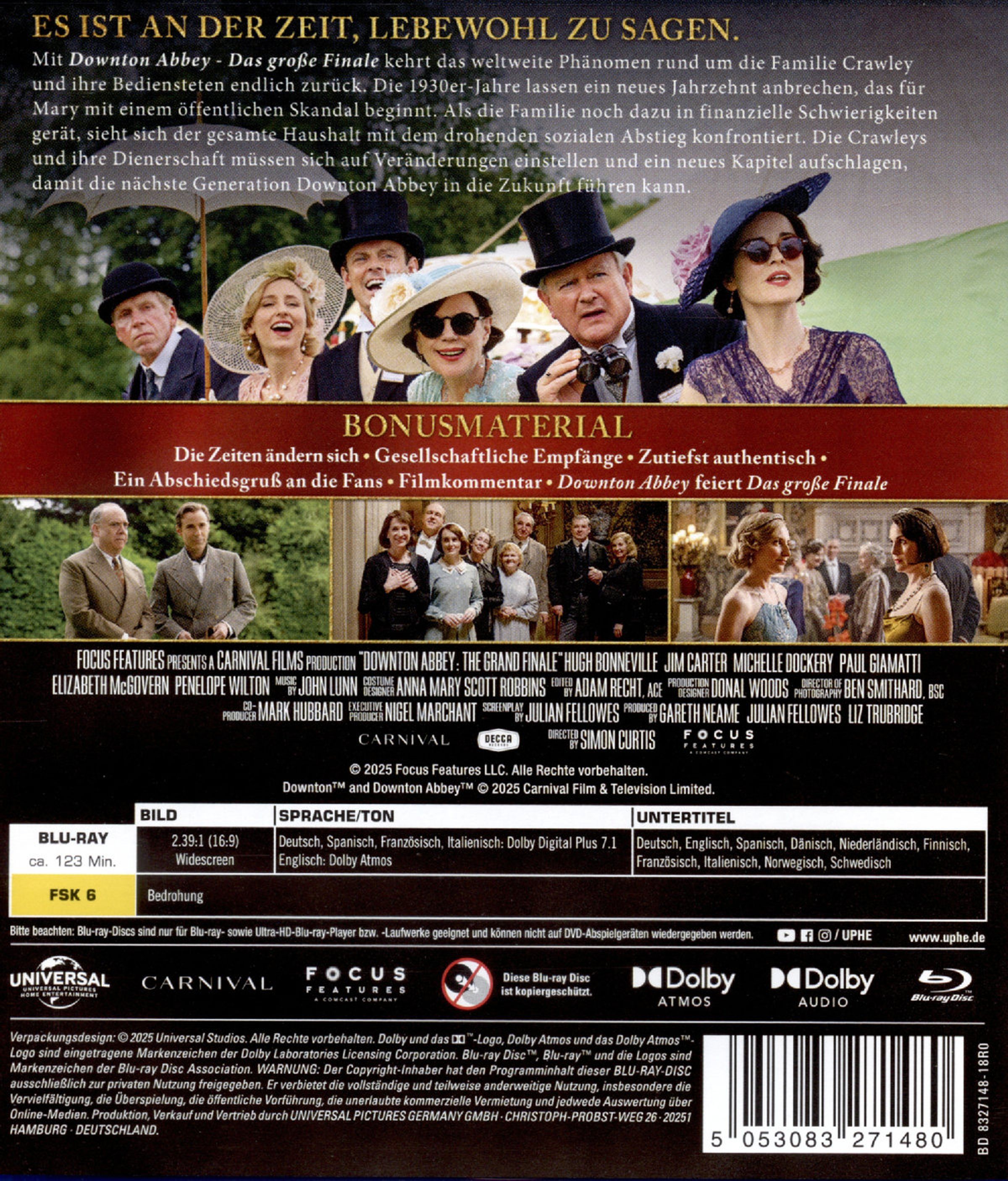 Mit DOWNTON ABBEY: DAS GROSSE FINALE kehrt das weltweite Phänomen rund um die Familie Crawley und ihre Bediensteten auf die große Leinwand zurück. Die 1930er-Jahre lassen ein neues Jahrzehnt anbrechen, das für Mary mit einem öffentlichen Skandal beginnt. Als die Familie noch dazu in finanzielle Schwierigkeiten gerät, sieht sich der gesamte Haushalt mit dem drohenden sozialen Abstieg konfrontiert. Die Crawleys und ihre Dienerschaft müssen sich auf Veränderungen einstellen und ein neues Kapitel aufschlagen, damit die nächste Generation Downton Abbey in die Zukunft führen kann.