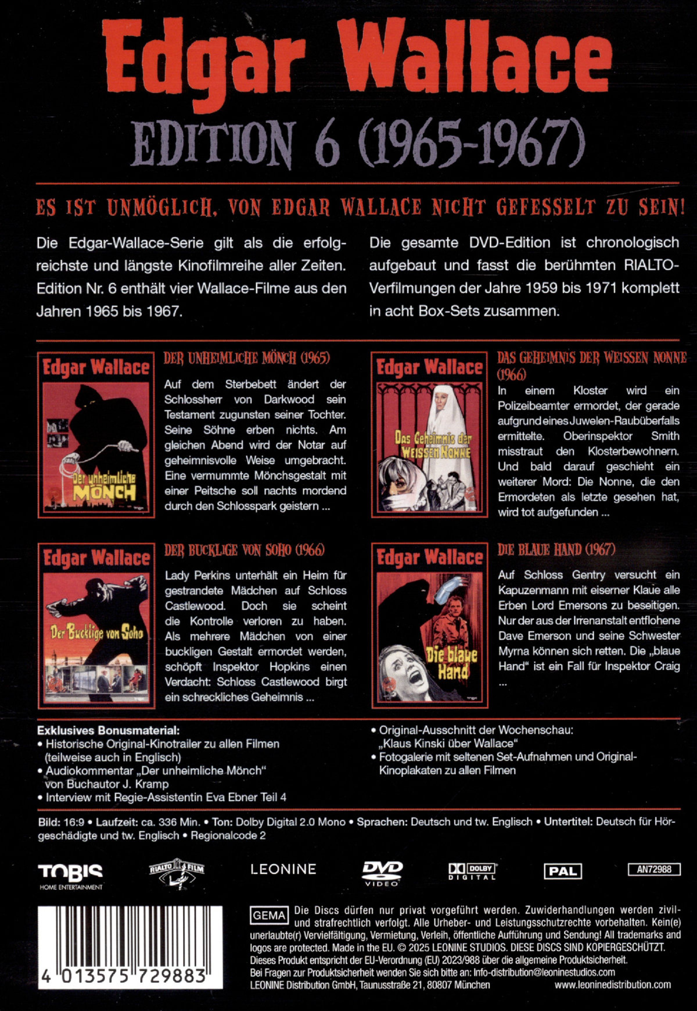 "Edgar Wallace EDITION 6", "1965-1967", "FSK ab 16". Illustrationen von Gesichtern, einer Figur mit Kapuze und Szenen in Blau und Gelb., 4 DVDs