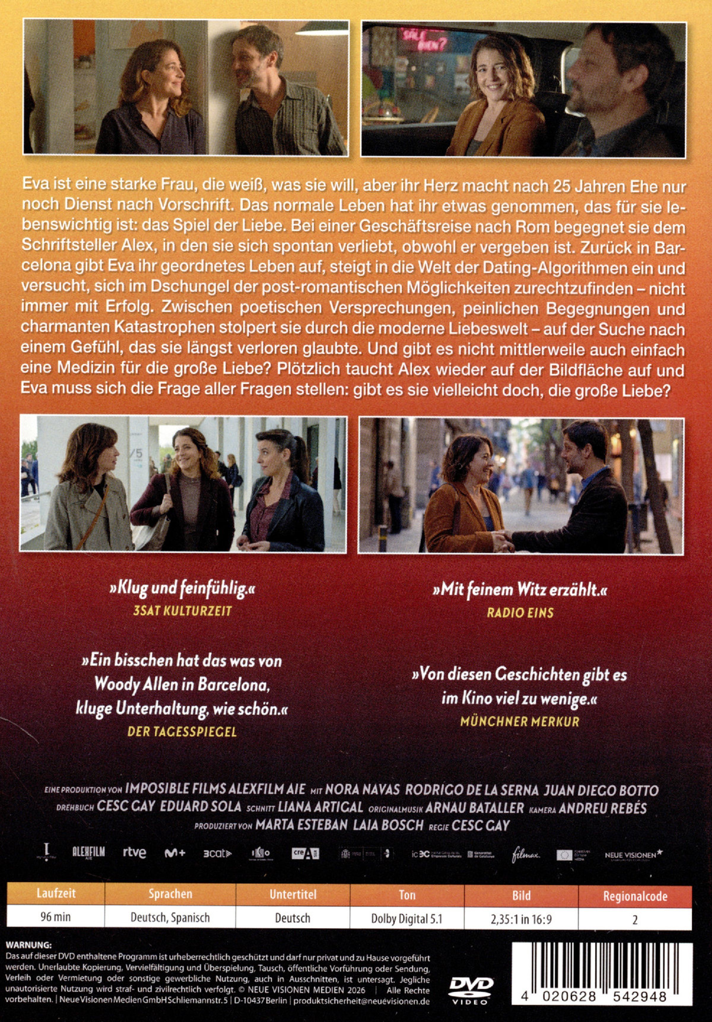 Eva ist eine starke Frau, die weiß, was sie will, aber ihr Herz macht nach 25 Jahren Ehe nur noch Dienst nach Vorschrift. Das normale Leben hat ihr etwas genommen, das für sie lebenswichtig ist: das Spiel der Liebe. Bei einer Geschäftsreise nach Rom begegnet sie dem Schriftsteller Alex, in den sie sich spontan verliebt, obwohl er vergeben ist. Zurück in Barcelona gibt Eva ihr geordnetes Leben auf, steigt in die Welt der Dating-Algorithmen ein und versucht, sich im Dschungel der post-romantischen Möglichkeiten zurechtzufinden - nicht immer mit Erfolg. Zwischen poetischen Versprechungen, peinlichen Begegnungen und charmanten Katastrophen stolpert sie durch die moderne Liebeswelt - auf der Suche nach einem Gefühl, das sie längst verloren glaubte. Und gibt es nicht mittlerweile auch einfach eine Medizin für die große Liebe? Plötzlich taucht Alex wieder auf der Bildfläche auf und Eva muss sich die Frage aller Fragen stellen: gibt es sie vielleicht doch, die große Liebe?