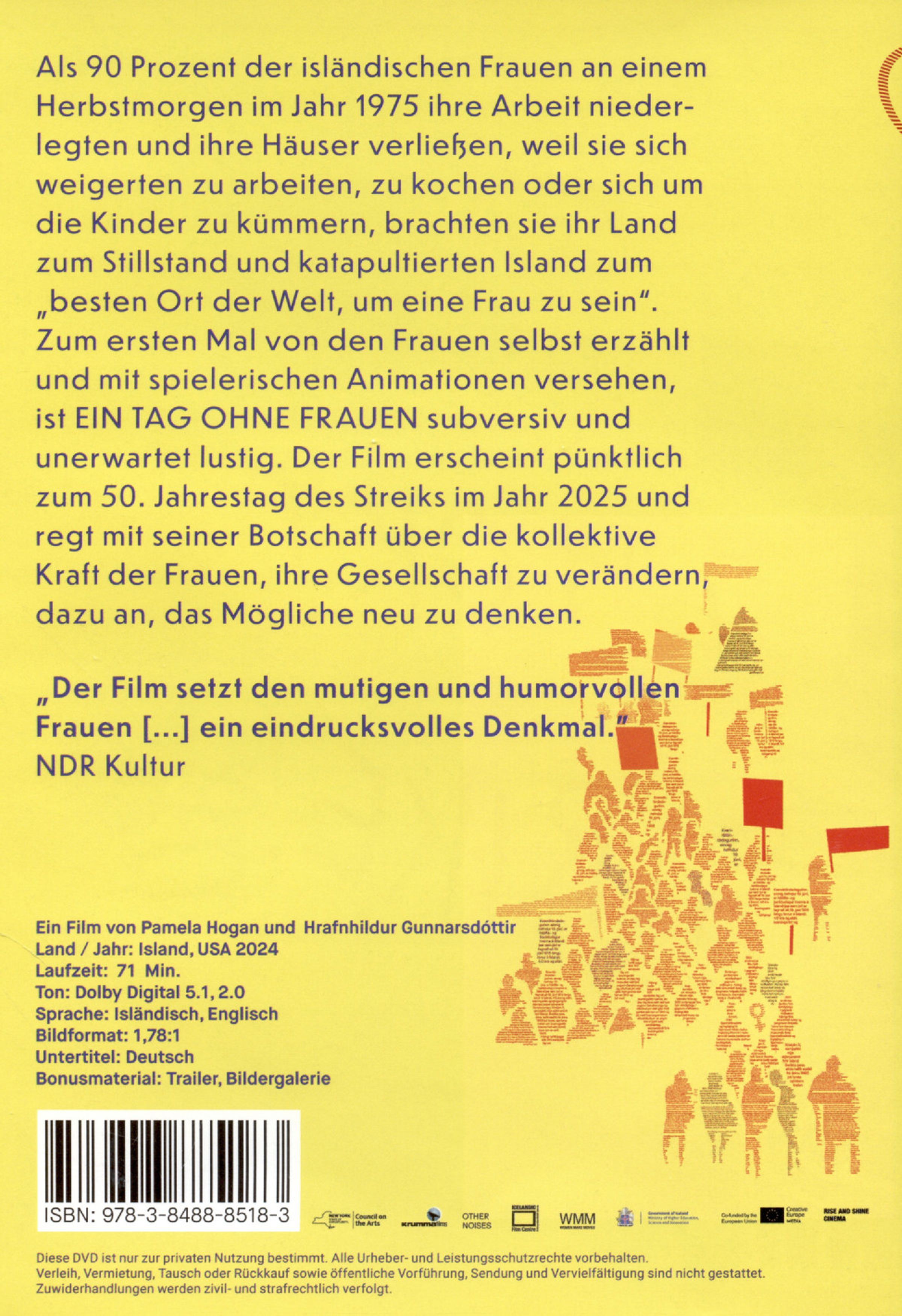 Als 90 Prozent der isländischen Frauen an einem Herbstmorgen im Jahr 1975 ihre Arbeit niederlegten und ihre Häuser verließen, weil sie sich weigerten zu arbeiten, zu kochen oder sich um die Kinder zu kümmern, brachten sie ihr Land zum Stillstand und katapultierten Island zum »besten Ort der Welt, um eine Frau zu sein«. Zum ersten Mal von den Frauen selbst erzählt und mit spielerischen Animationen versehen, ist EIN TAG OHNE FRAUEN subversiv und unerwartet lustig. »Wir liebten unsere chauvinistischen Schweine«, erinnert sich eine der Aktivistinnen, »wir wollten sie nur ein wenig verändern!«