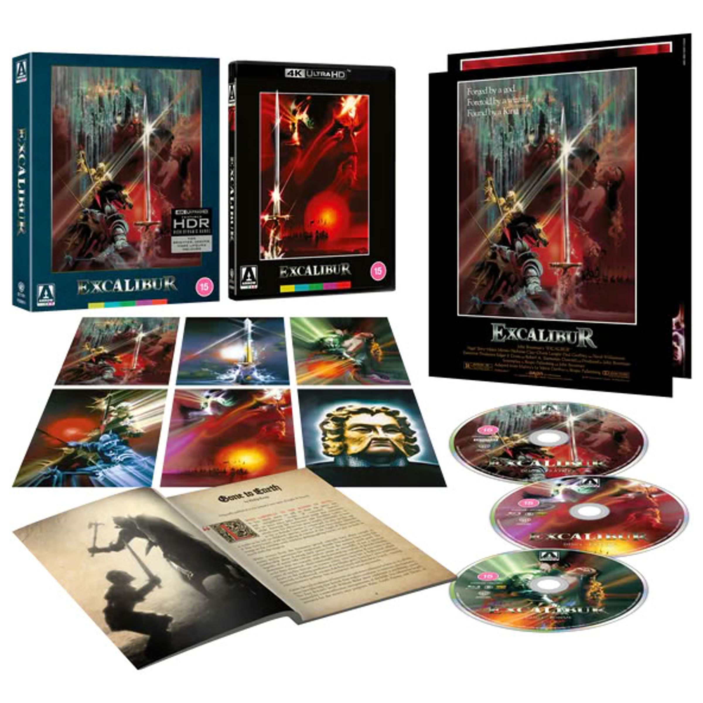 Special Features: Booklet, Bonus Footage, Commentary: Theatrical Cut: Brian Hoyle (author); David Kittredge (film-maker); John Boorman, Documentaries: 'Anam Cara'; 'Divided Nature'; ''Excalibur': Behind the Movie', Image Gallery, Interviews: John Boorman (director) and Charley Boorman (actor); Neil Jordan (creative associate); Anthony Pratt (production designer); Peter MacDonald (2nd unit director), Making of Documentary, 4K (2160p) UHD Blu-ray presentation of the 141-minute Theatrical Cut in Dolby Vision (HDR10 compatible); 120-minute TV Version of the film; Reversible sleeve featuring two original artwork options; Double-sided fold-out poster featuring two original artwork options; Six postcard-sized reproduction art cards, Trailers