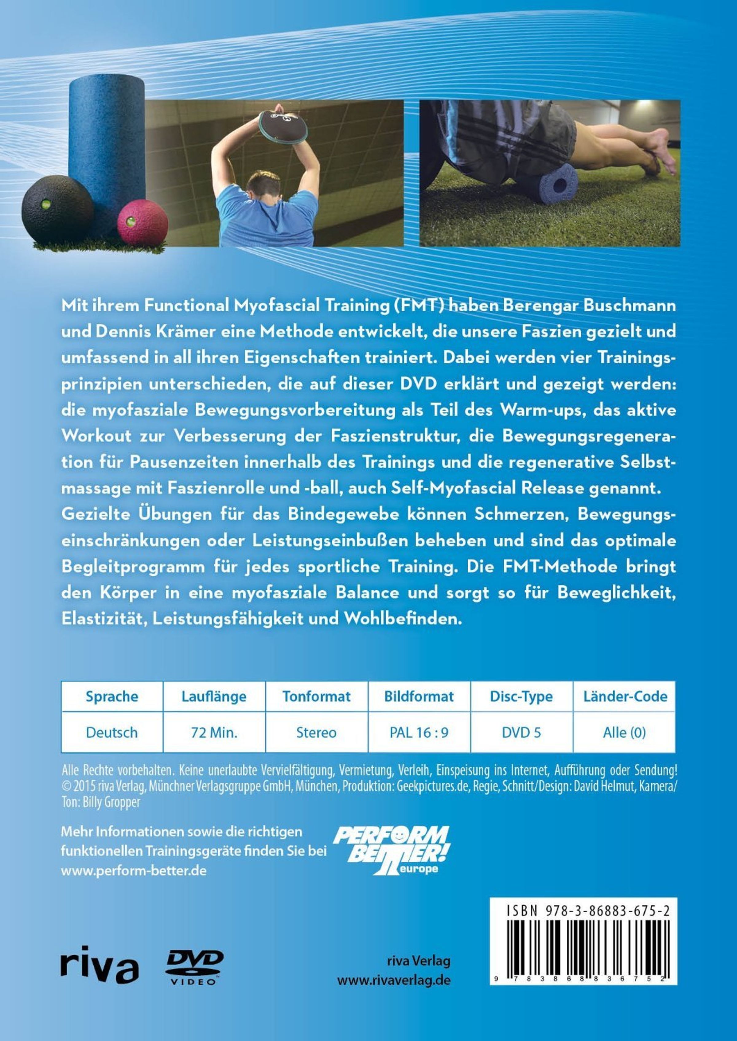 Kein Thema wird in der Sportszene momentan so hoch gehandelt wie die Faszien und das myofasziale Training. Die Wissenschaft entdeckt das Thema seit einigen Jahren ganz neu und mehr und mehr Sportler und Trainer beziehen Übungen für das Bindegewebe in ihre Bewegungsprogramme ein. Mit ihrem Functional Myofascial Training (FMT) haben Berengar Buschmann und Dennis Krämer eine systematische Trainingsmethode entwickelt, die unsere Faszien gezielt und umfassend in all ihren Eigenschaften trainiert. Dabei werden vier Trainingsarten unterschieden, die auf dieser DVD erklärt und gezeigt werden: die myofasziale Bewegungsvorbereitung als Teil des Warm-ups, das aktive Workout zur Verbesserung der Faszienstruktur, die Bewegungsregeneration für Pausenzeiten innerhalb des Trainings und die regenerative Selbstmassage mit Faszienrolle und -ball, auch Self-Myofascial Release (SMR) genannt. Gezielte Übungen für das Bindegewebe können Schmerzen, Bewegungseinschränkungen oder Leistungseinbußen beheben und sind das optimale Begleitprogramm für jedes sportliche Training. Die FMT-Methode bringt den Körper in eine myofasziale Balance und sorgt so für Beweglichkeit, Elastizität, Leistungsfähigkeit und Wohlbefinden.