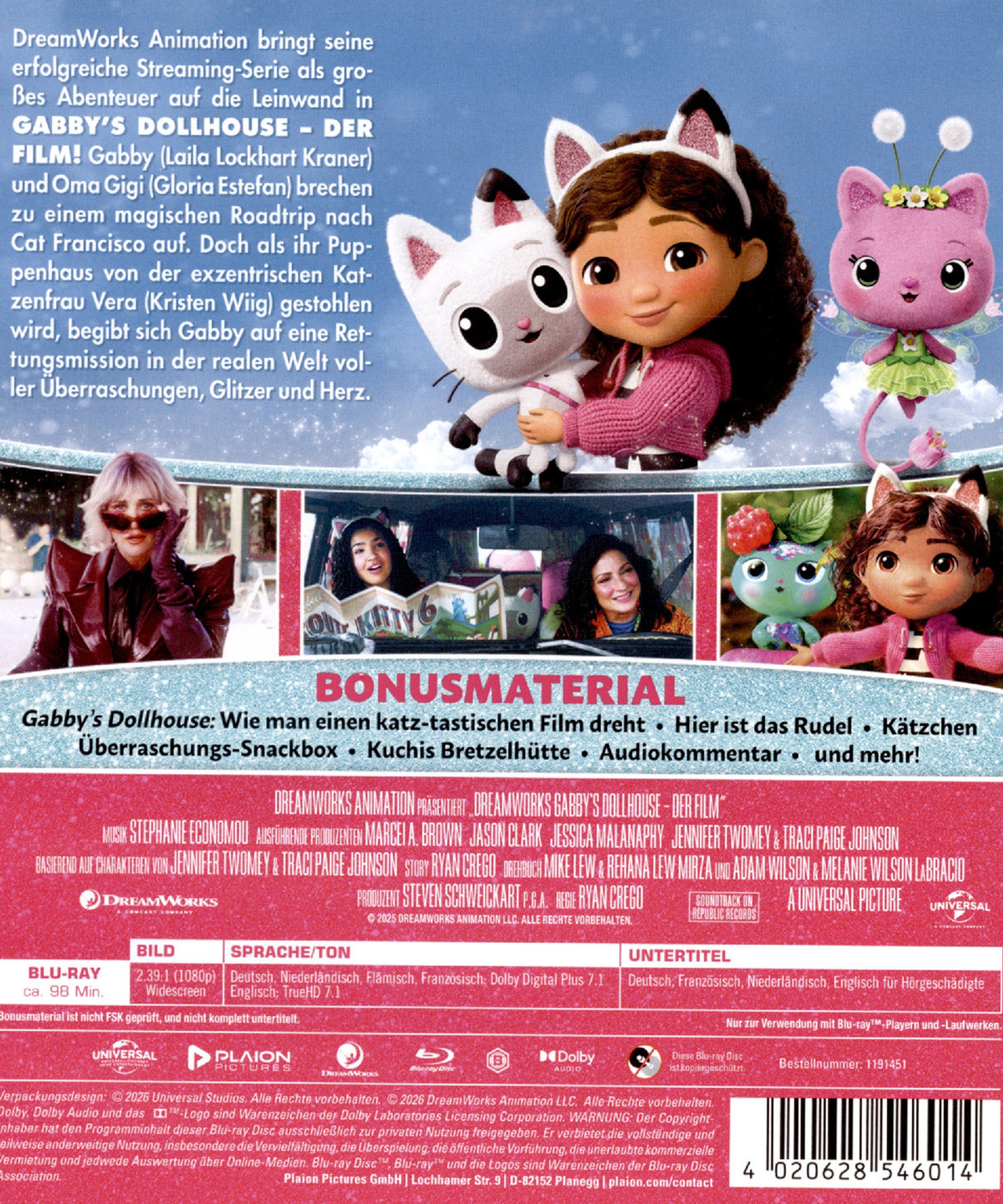 Mit GABBY’S DOLLHOUSE: DER FILM bringt DreamWorks Animation die weltweit erfolgreiche Serie für ein erstes, miaufregendes Kinoabenteuer endlich auf die Leinwand. Dabei erlebt Gabby ein katztastisches Abenteuer: Bei einem Roadtrip mit ihrer Großmutter Gigi in Richtung Katz Francisco gerät ihr über alles geliebtes, kunterbuntes Puppenhaus in die Pfoten der exzentrischen Katzenliebhaberin Vera. Schnell muss Gabby all ihre cleveren Kätzchen zusammentrommeln, um mit Hilfe der kleinen Freunde ihren kostbarsten Besitz zu retten. Seit 2021 feiern dank Gabby's Dollhouse Kinder auf der ganzen Welt eine riesige Streuselparty mit Gabby und ihren katztastischen Freunden. Die von Traci Paige Johnson und Jennifer Twomey erdachte Serie für Vorschulkinder beginnt jedes Mal mit dem Auspacken einer ganz besonderen Überraschung, bevor sie aus der realen in eine wunderbar animierte Welt voller niedlicher Katzen springt, die alle in Gabbys Puppenhaus leben.