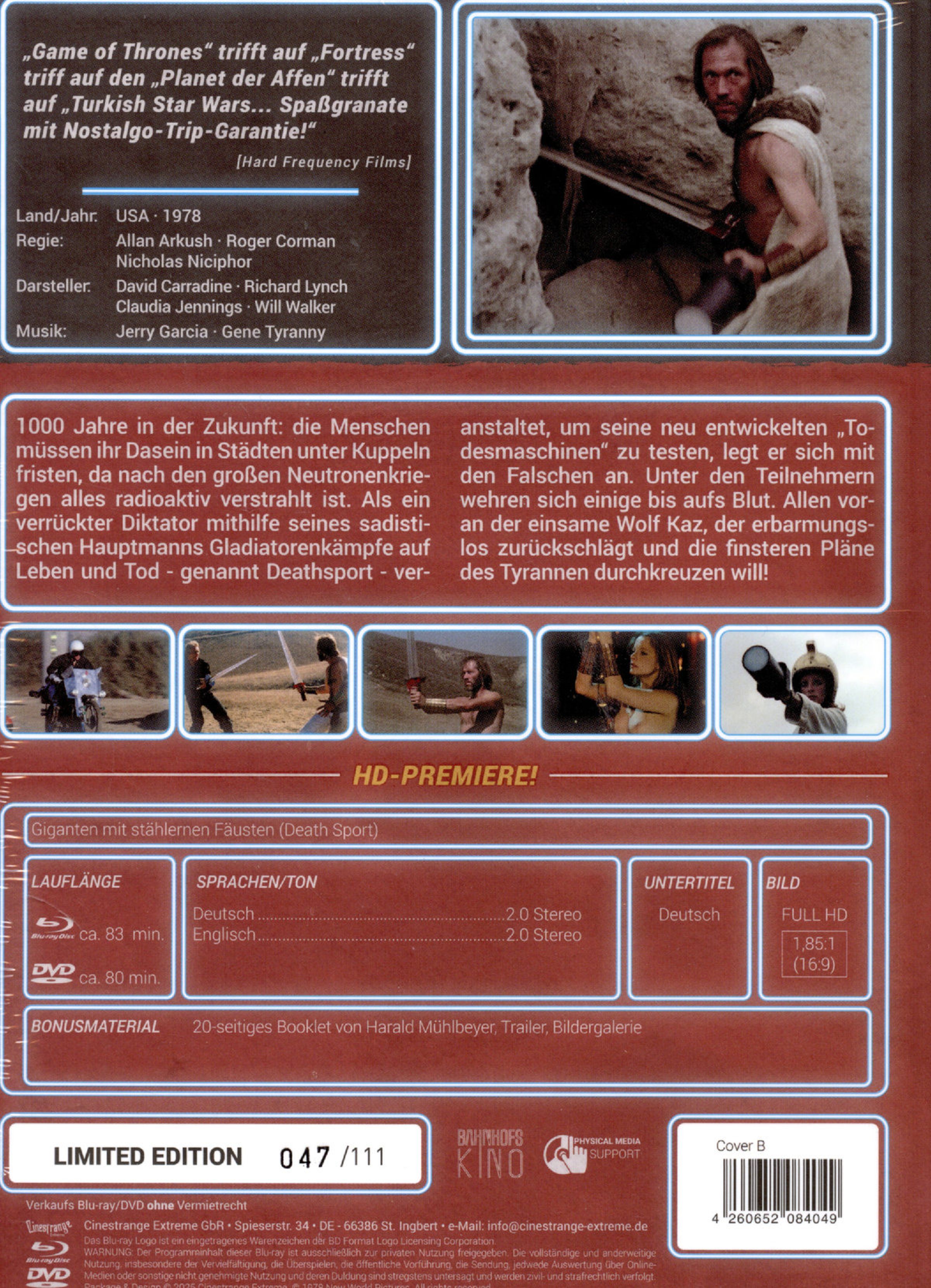 CINESTRANGE EXTREME präsentiert in der Reihe »Bahnhofs-Kino« als Edition Nummer 14 einen waschechten Vertreter der Grindhouse-Bahnhofskino-Fraktion. Produziert und co-regiert von niemand geringerem als Roger Corman. Mit den bekannten und beliebten Hackfressen David Carradine als wackerer Held, und Richard Lynch einmal mehr als fieser Bösewicht. Dass man auch garantiert auf seine Kosten kommt, sei angemerkt, dass der Film bereits seine Adelung bei Schlefaz erhielt.