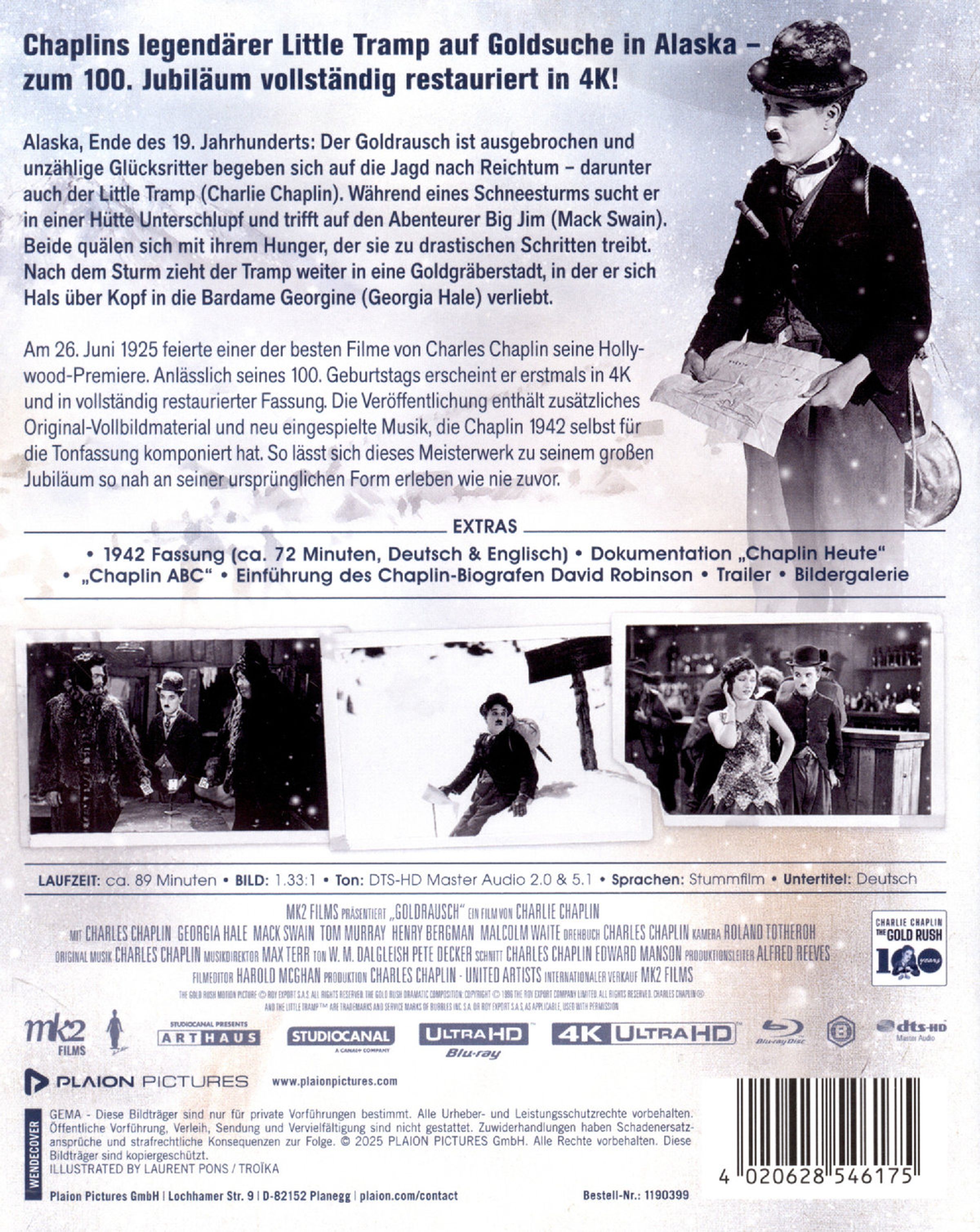Am 26. Juni 1925 feierte einer der besten Filme von Charles Chaplin seine Hollywood-Premiere. Anlässlich seines 100. Geburtstags erscheint er erstmals in 4K und in vollständig restaurierter Fassung. Die Veröffentlichung enthält zusätzliches Original-Vollbildmaterial und neu eingespielte Musik, die Chaplin 1942 selbst für die Tonfassung komponiert hat. So lässt sich dieses Meisterwerk zu seinem großen Jubiläum so nah an seiner ursprünglichen Form erleben wie nie zuvor.