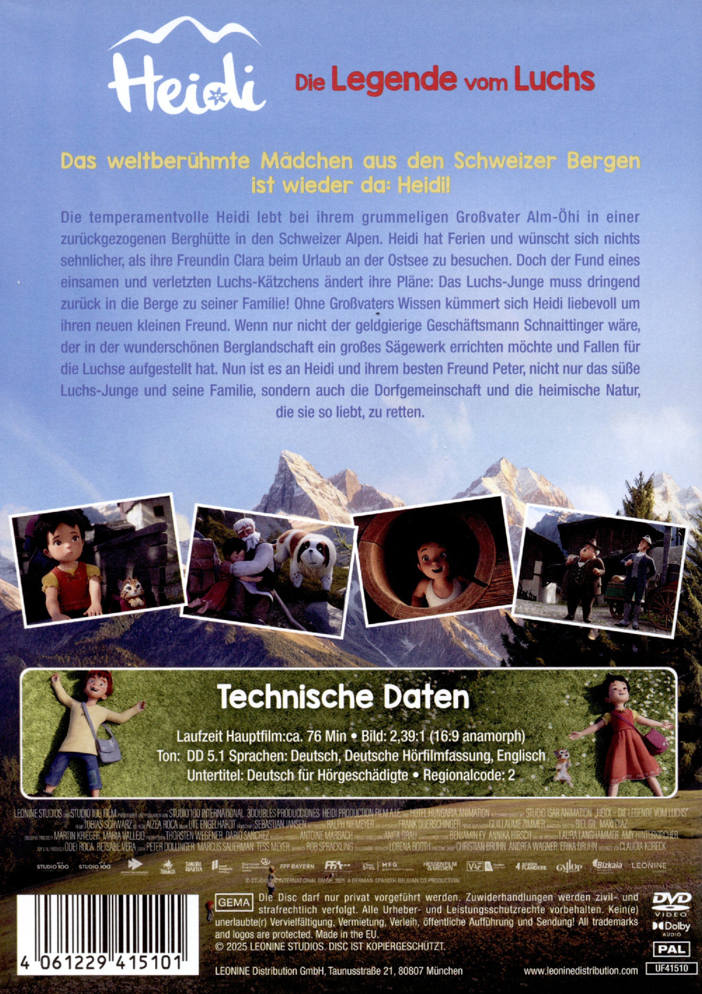Die temperamentvolle Heidi lebt bei ihrem grummeligen Großvater Alm-Öhi in einer zurückgezogenen Berghütte in den Schweizer Alpen. Heidi hat Ferien und wünscht sich nichts sehnlicher, als ihre Freundin Clara beim Urlaub an der Ostsee zu besuchen. Doch der Fund eines einsamen und verletzten Luchs-Kätzchens ändert ihre Pläne: Das Luchs-Junge muss dringend zurück in die Berge zu seiner Familie! Ohne Großvaters Wissen kümmert sich Heidi liebevoll um ihren neuen kleinen Freund. Wenn nur nicht der geldgierige Geschäftsmann Schnaittinger wäre, der in der wunderschönen Berglandschaft ein großes Sägewerk errichten möchte und Fallen für die Luchse aufgestellt hat. Nun ist es an Heidi und ihrem besten Freund Peter, nicht nur das süße Luchs-Junge und seine Familie, sondern auch die Dorfgemeinschaft und die heimische Natur, die sie so liebt, zu retten.