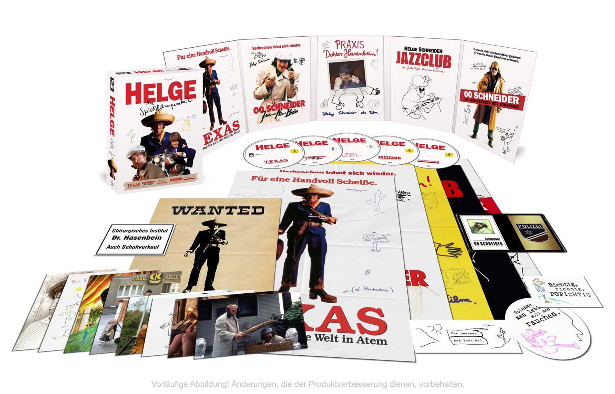 Das Paket enthält brandneue Turbine-Restaurierungen von den original Filmnegativen der Klassiker von 1993 bis 2004 - freigegeben von Regisseur Schneider. Aus dem Archiv gibt es Audiokommentare und jede Menge Bonusmaterial. Die pickepackevolle Box verfügt aber auch über 00 Schneiders Dienstausweis, sechs Poster, acht Artcards und vier Sticker.